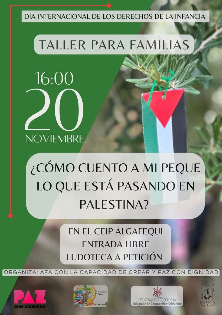 Por todo ello, mañana lunes día 20, la AFA ha organizado varias actividades. Una de ellas es una charla-taller titulada «¿Cómo cuento a mi peque lo que está pasando en Palestina?» Esta actividad se llevará a cabo entre las 16:00 a 17:30 horas en el aula de usos múltiples del CEIP Algafequi. El taller está co-organizado por la propia AFA y la ONGD Paz con Dignidad, contando con la financiación del Área de Cooperación del Ayuntamiento de Córdoba en el marco del proyecto “Creando lazos de solidaridad en la ciudadanía cordobesa por la defensa de los DDHH y la Solidaridad Internacional«, subvencionado en 2022.