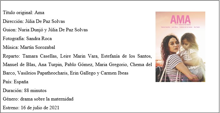 Ama parte del previo cortometraje homónimo realizado por la misma directora en 2017 como trabajo final de la ESCAC -Escuela Superior de Cine y Audiovisuales de Cataluña- en el cual nos hablaba sobre el arrepentimiento y el abandono. En el largometraje nos encontramos con un crudo retrato de las maternidades en crisis -tanto económicas como emocionales- llenas de rabia, obstáculos, soledad y, sobre todo, culpabilidad. Júlia De Paz Solvas crea una intimista ópera prima desde un relato que, pese a tratar el tema de la maternidad, lo hace con una mirada diferente, plagada de naturalismo y veracidad, con la finalidad de romper el mito y los estereotipos que tenemos al respecto, mostrándonos así, unas maternidades plurales.