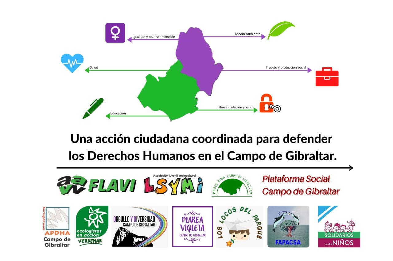 APDHA, Lo Sé Y Me Importa, Verdemar Ecologistas en Acción, Marea Violeta, FLAVI, FAPACSA, Orgullo y Diversidad, Marea Verde, Los Locos del Parque, Solidarios con los Niños/as y la Plataforma Social Comarcal se unen para denunciar la vulneración de derechos humanos en el Campo de Gibraltar con ocasión del día internacional que conmemora el pacto de Naciones Unidas.