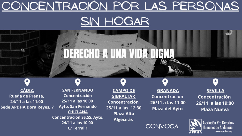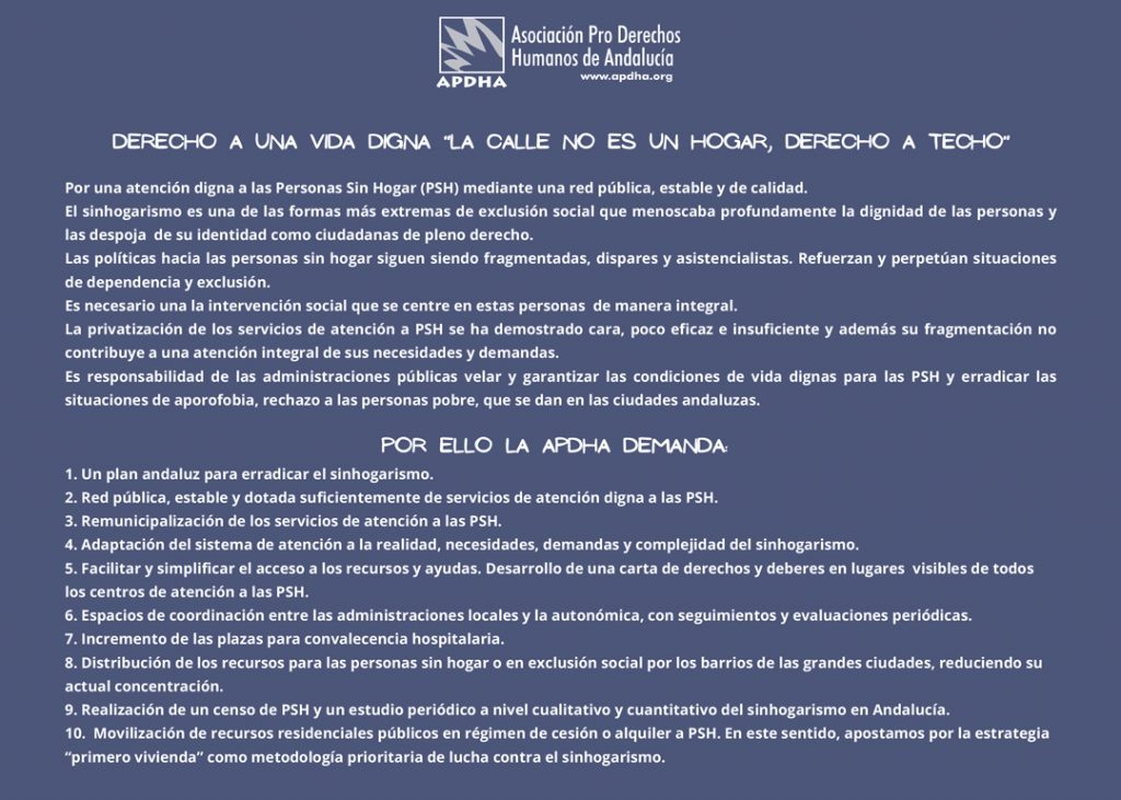 La Asociación Pro Derechos Humanos de Andalucía (APDHA) pidió ayer, 23 de noviembre, Día Europeo de las Personas Sin Hogar, un decálogo de demandas entre las que se encuentra la de elaborar un plan andaluz para erradicar el sinhogarismo. Un plan, exige, que sea participado, con medidas a corto, medio y largo plazo, y que cuente con el reconocimiento de las personas sin hogar.