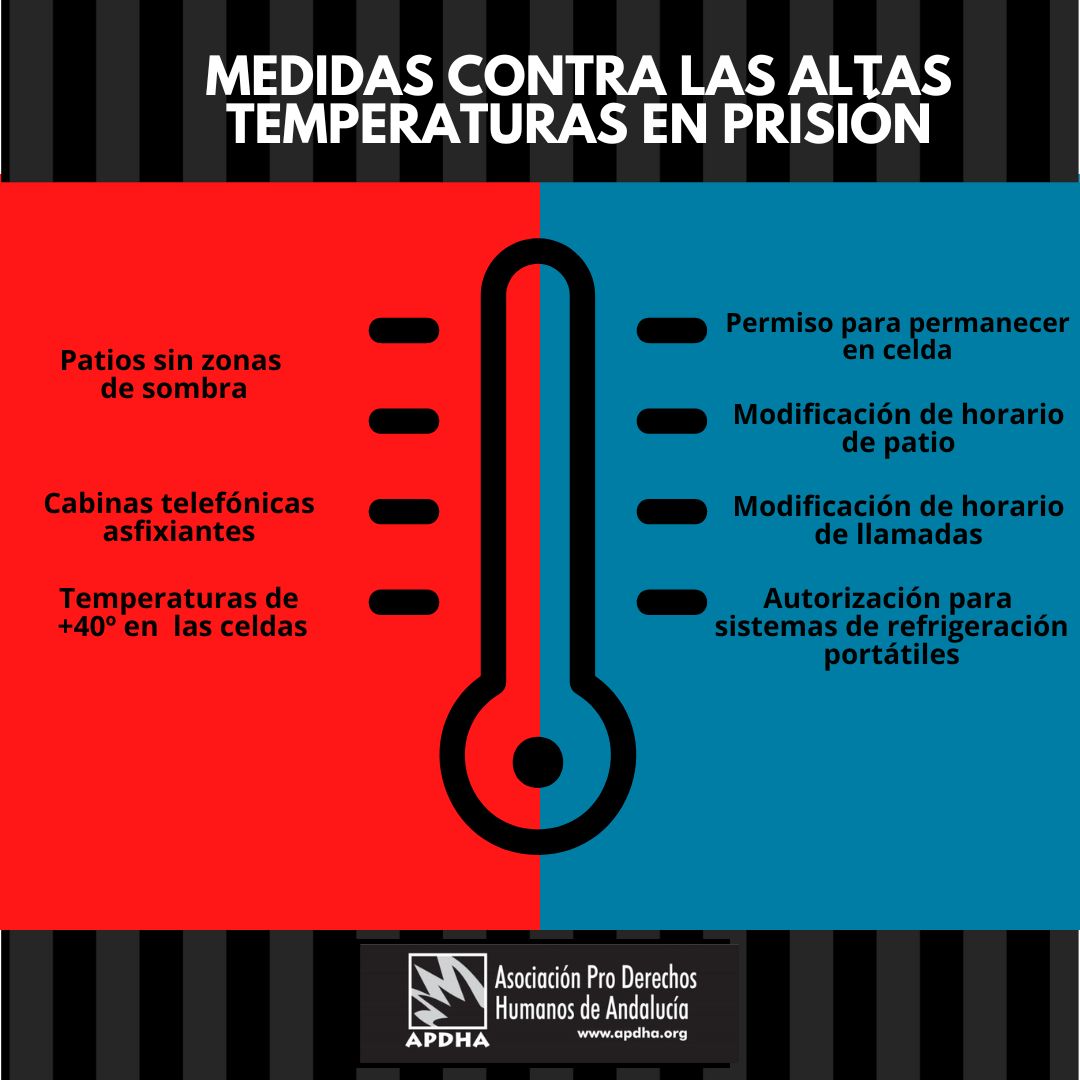En plena ola de calor, con avisos rojos en Andalucía por temperaturas que superan con los 40º C en Sevilla, Córdoba o Jaén, desde la organización destacan que «con estas temperaturas se hace muy difícil la vida en prisión, siendo imposible conciliar el sueño, realizar actividades o permanecer en el patio». Aunque reconocen que en la mayoría de los centros penitenciarios disponen de sistemas de refrigeración en las zonas de comunicaciones y locutorios, «en algunas prisiones solo disponen de ventiladores o se encuentran averiados, como es el caso de Córdoba, donde entrar al vis a vis es, según transmiten los propios familiares, como entrar a una sauna».