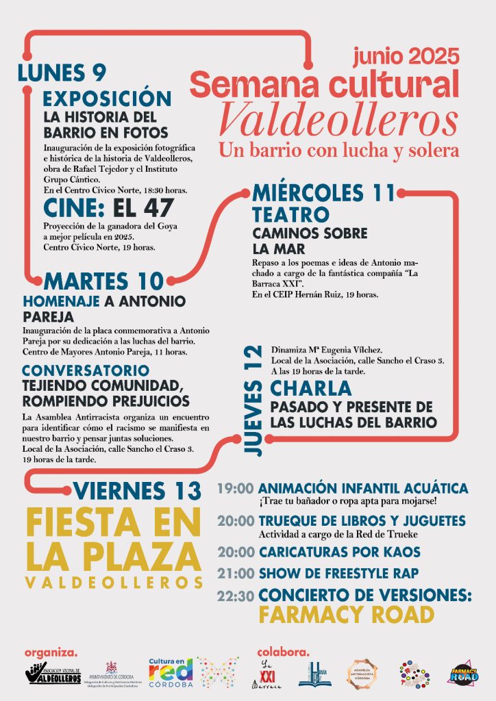 Por último, el viernes 13 por la tarde y noche concluirá esta semana cultural con una fiesta colectiva en la Plaza de Valdeolleros, que será amenizada con juegos infantiles, caricaturas, trueque de libros, pintura, rap y música de un grupo de nuestro barrio: Farmacy Road.