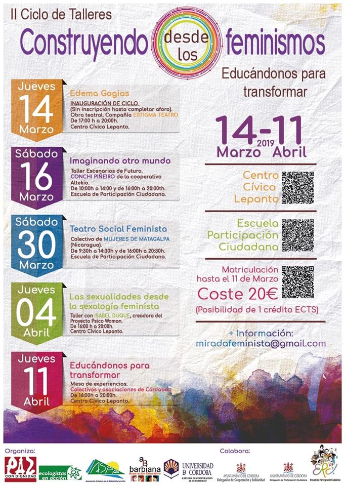 En Córdoba, junto a otras 4 entidades estamos organizando el II Ciclo de Talleres «Construyendo desde los feminismos». Os presentamos el cartel. Nuestra recomendación es que te apuntes al curso completo (posibilidad de un crédito ECTS). Pincha en este enlace para inscribirte el plazo acaba el 11 de marzo. Para cualquier duda escríbenos al correo miradafeminista@gmail.com.