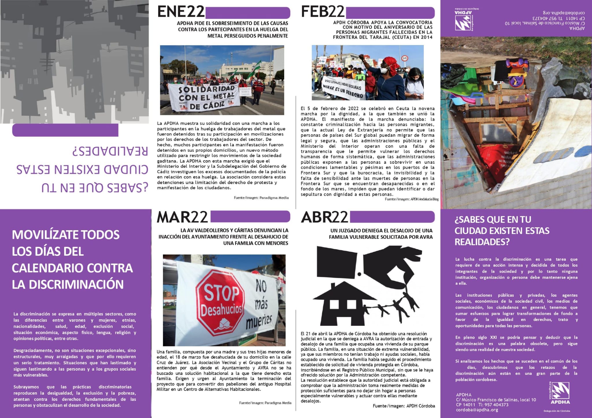 Cada 21 de marzo, con motivo del día internacional contra la discriminación, la delegación en Córdoba de la APDHA hace público el Calendario contra la discriminación, donde se denuncian las principales situaciones discriminatorias acaecidas durante el año anterior en la provincia de Córdoba. El objetivo de este documento es sensibilizar a la ciudadanía cordobesa sobre estas realidades, que son las violaciones de Derechos Humanos más cercanas y cotidianas, pero no por ello menos graves e inaceptables.