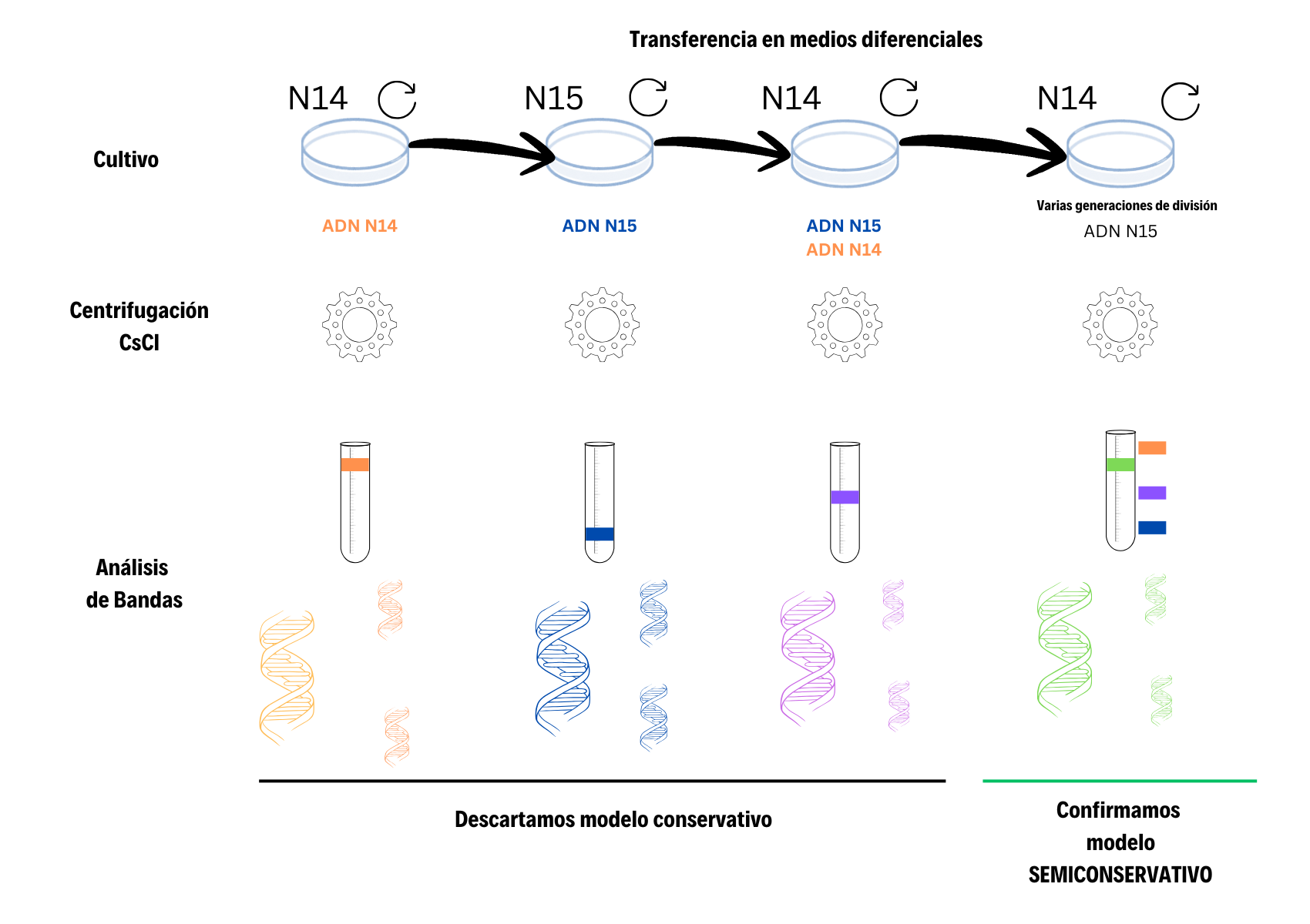 Un experimento que combina microbiología, física cinética y la biología molecular para demostrar que nuestro ADN mantiene una hebra de sus células previas y una nueva hebra que se genera en el proceso de replicación.