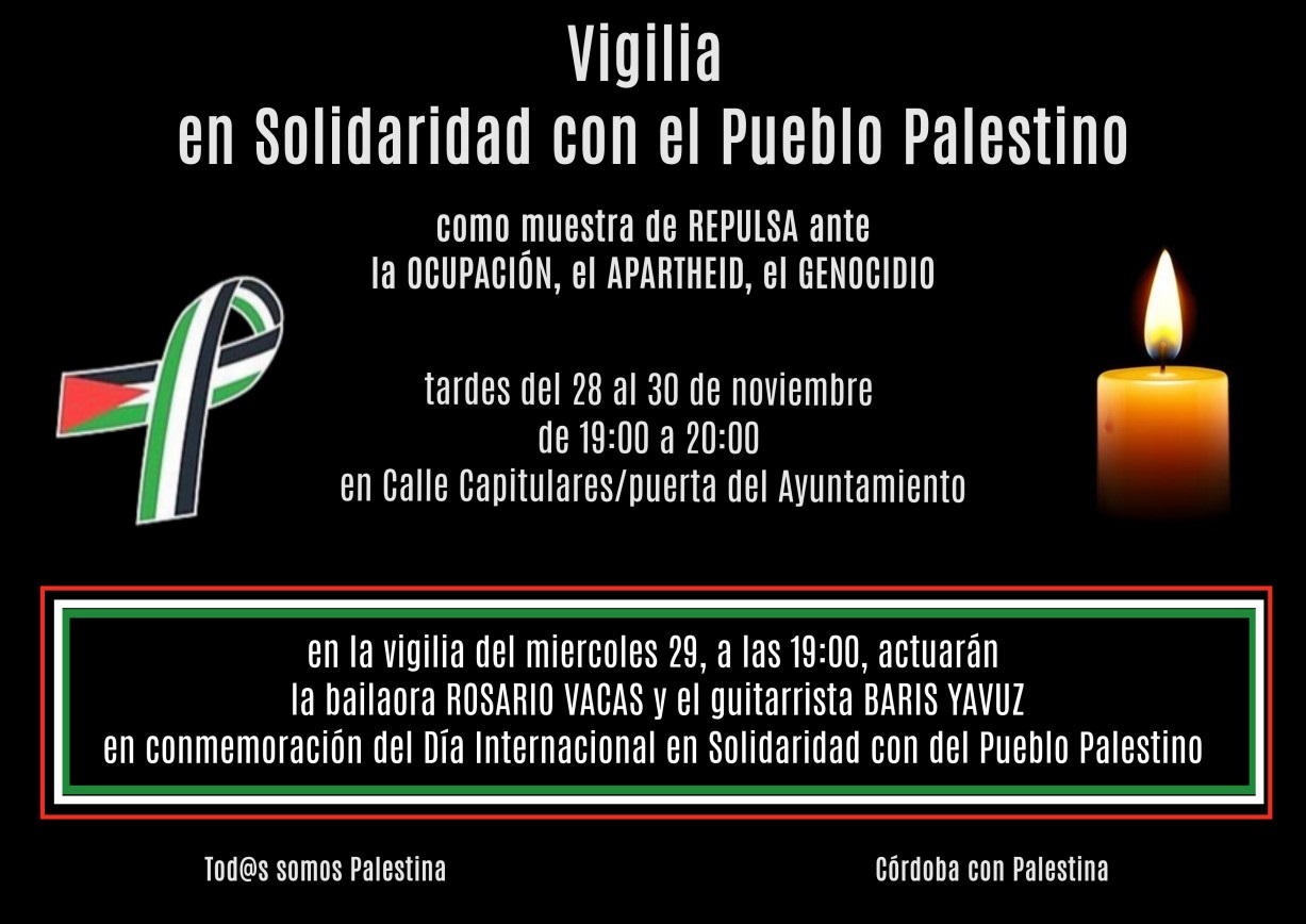 La Plataforma «Córdoba con Palestina» se sumará a la convocatoria de la plataforma andaluza concentrándose el domingo día 12 de noviembre a las 12 del mediodía en el Árbol de la Resistencia del Pueblo Palestino situado en los Jardines de la Agricultura (Los Patos) junto a la Biblioteca del Estado.