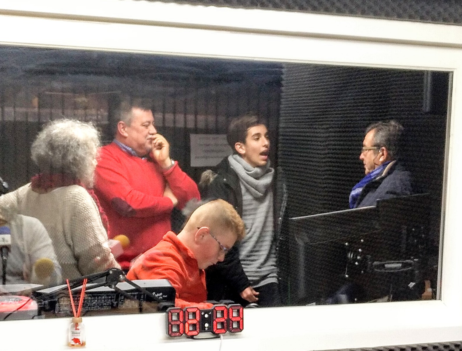Como pueden comprobar en nuestra foto de portada, el estudio y el recibidor de nuestra emisora es un foro continuo de debate entre las personas que van participando en el programa. En la imagen, Juan Ariza Otano, un chico de 15 años, hablando ante la mirada atónita, por lo que dice y cómo lo dice, de Miguel Santiago, Pepa Pérez y Rafael Juan.