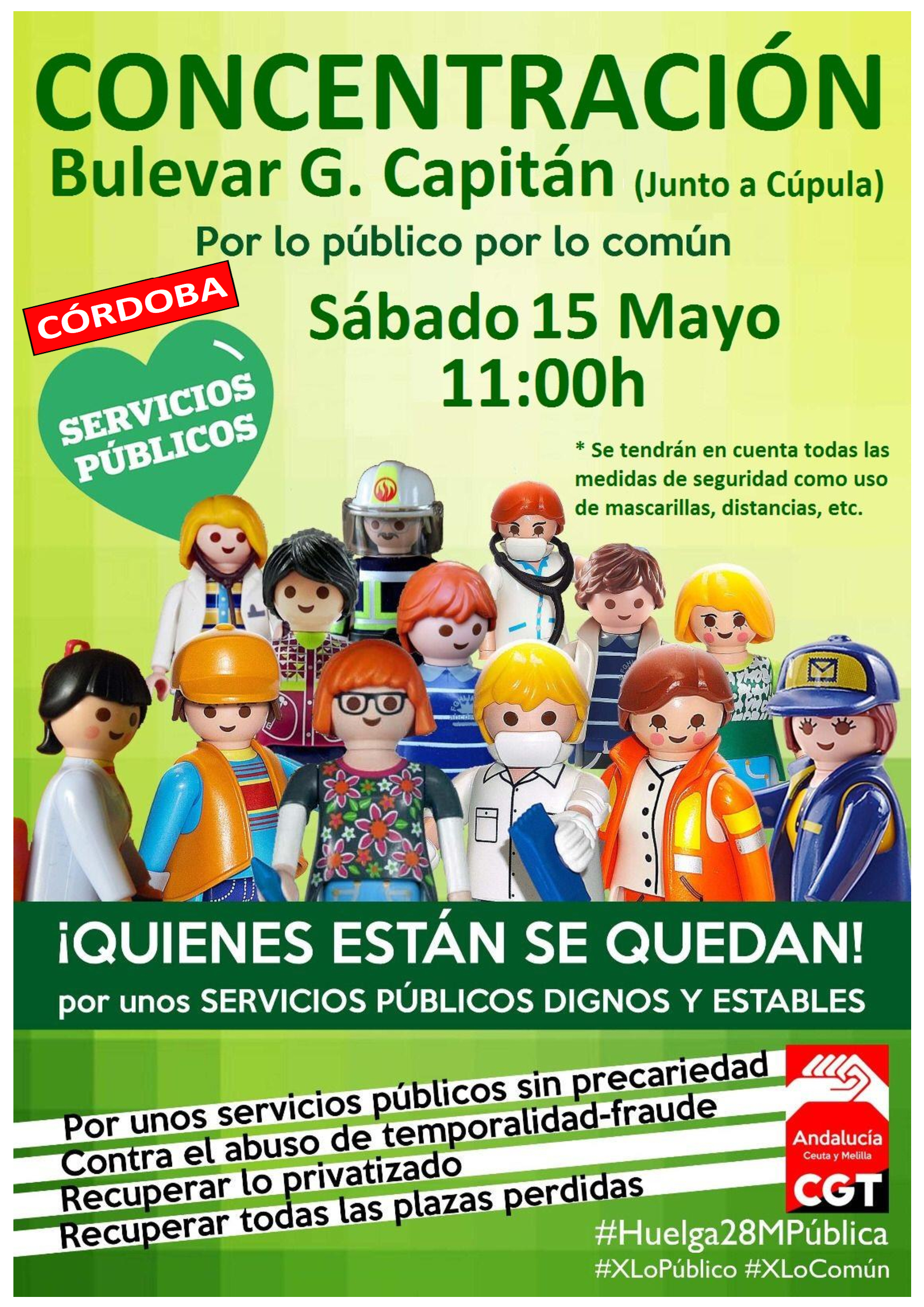 CGT ha convocado para este sábado día 15 de mayo, entre las 11 y las 14 horas, una concentración en el Bulevar de la Avda. Gran Capitán como parte de los diversos actos que tienen previsto realizar para dar a conocer las reivindicaciones de la huelga convocada para el próximo día 28 de mayo en todo el Sector Público de Andalucía, que son la estabilidad laboral, el aumento de empleo público y la recuperación de los servicios privatizados, por lo que llaman a una masiva participación de los y las trabajadoras convocadas a dicha huelga.