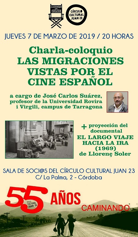 El jueves 7 de marzo tendrá lugar en el Círculo Cultural Juan 23 de Córdoba (c/ La Palma, 2) la charla-coloquio titulada Las migraciones vistas por el cine español, que impartirá José Carlos Suárez, profesor de la Universidad Rovira i Virgili en su campus de Tarragona. Tras la ponencia del conferenciante se proyectará, como complemento de la misma, el documental El largo viaje hacia la ira, realizado en 1969 por Llorenç Soler. El acto está organizado por el Colectivo Amig@s del Cine del C.C. Juan 23 y comenzará a las 20 horas.