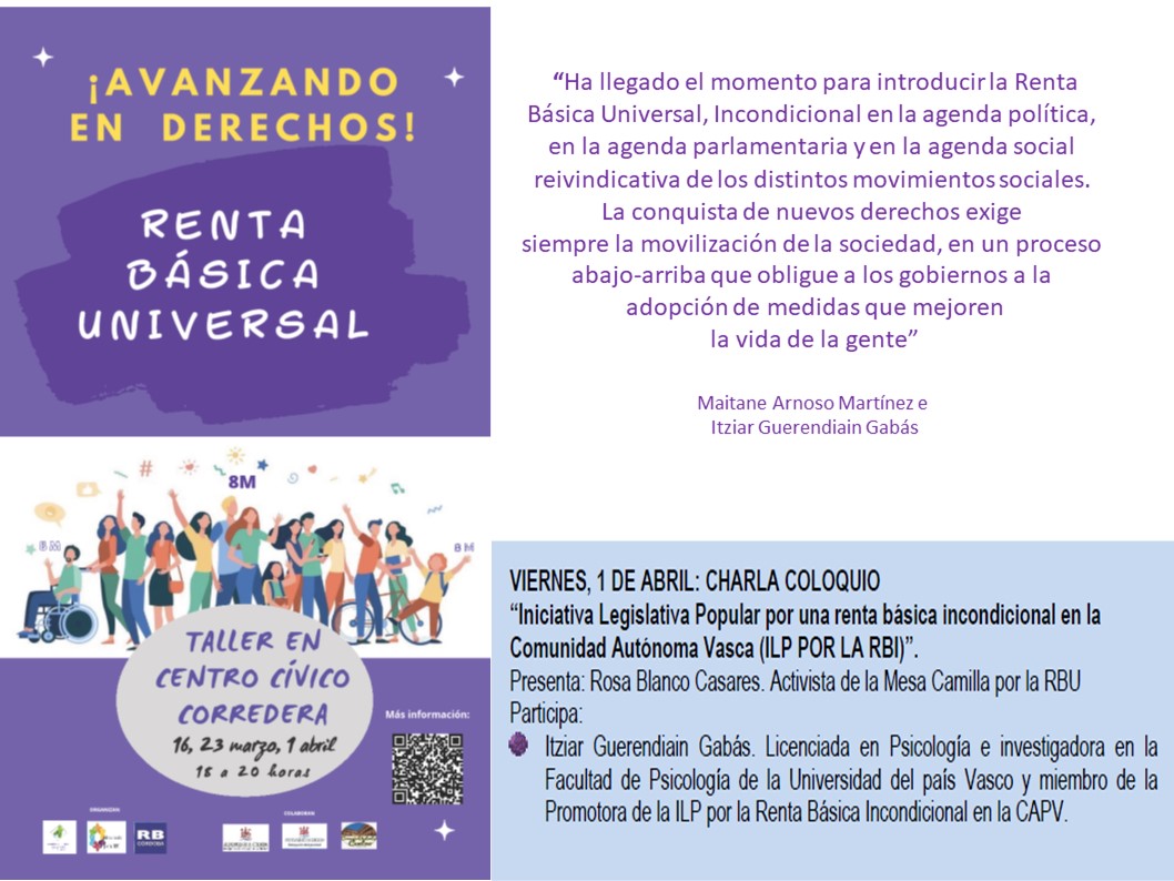 Para hablar sobre ello han invitado a Itziar Guerendiain Gabás, que es licenciada en Psicología e investigadora en formación en la Facultad de Psicología de la Universidad del País Vasco y una de las promotoras de esta iniciativa, a una charla coloquio, que se celebrará en la última sesión de este taller sobre Renta Básica Universal de esta tarde de viernes.