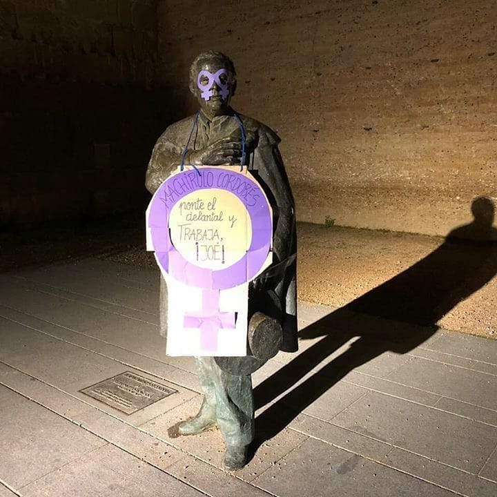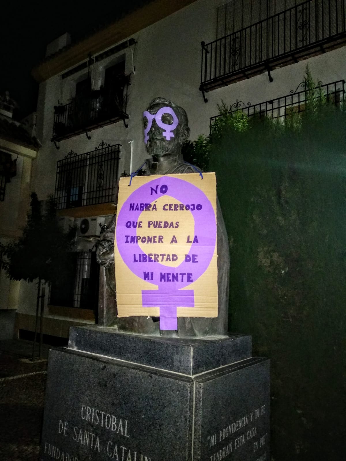 Este 8 de marzo de Huelga General y día internacional de la mujer multiplica su manera de expresar las reinvindicaciones feministas. Las cordobesas/es han contemplado en varias calles y plazas mensajes colocados en estatuas emblemáticas de la ciudad que, en la práctica, educan en feminismo. Mensajes tales como «no habrá cerrojo que puedas imponer a la libertad de mi mente» en la estatua de Cristobal de Santa Catalina; «Ni un paso atrás«, en la fuente junto a la Plaza Colón; «Hijo, el trabajo de la casa se comparte«, en la escultura denominada Vientos de cambio, «Fuera vuestros rosarios de nuestros ovarios», en la Plaza de las Capuchinas, presidida por el monumento al Obispo Osio, a quien se deben nada más y nada menos que la invención del catolicismo, mediante la fijación de su dogmática definitiva, y de instituciones de tan largo alcance en la historia europea y mundial como la persecución religiosa, la represión sexual universal y obligatoria, la judeofobia y la misoginia, preterición definitiva de la mujer de la vida pública, en palabras de nuestro colaborador Manuel Harazem; «¿Ande las lleva usted padre? Ahh, a enseñarles de igualdad«, en la estatua de Plaza de las Cañas; «Séneca y Nerón levantad los huevos del sillón«, en la estatua dedicada a estos dos insignes romanos, emperador y filósofo; A la estatua de Góngora que preside la plaza de la Trinidad se le dedicó el lema «Machote Gongoret, coge la escoba y barre, sipote«; o «suelta el capote y ponte a fregar sipote«, colgada de la estatua de Manolete en la Plaza de Santa Marina…
