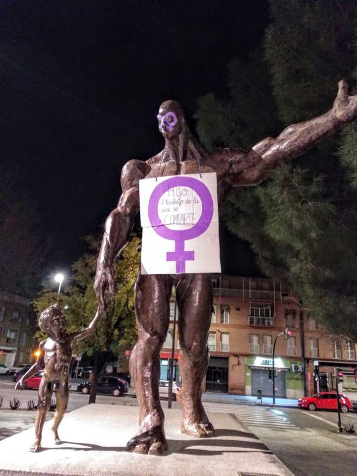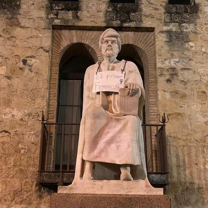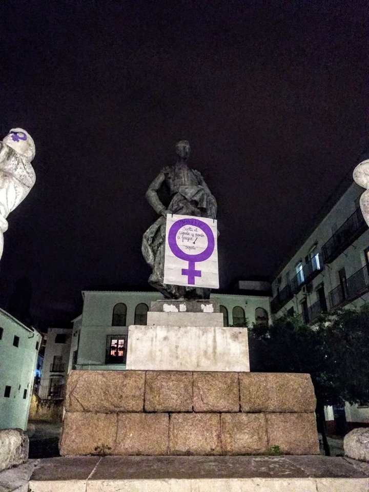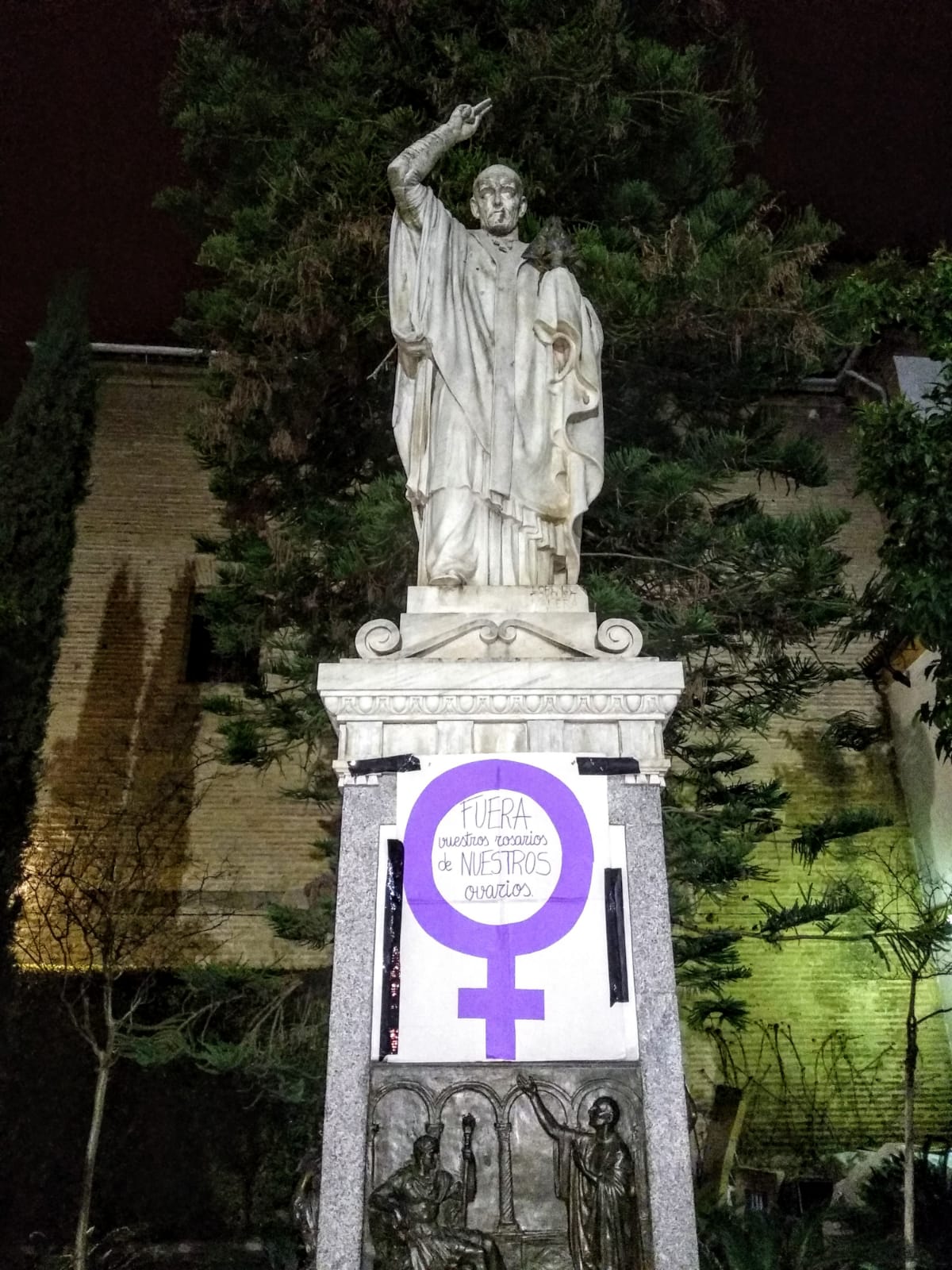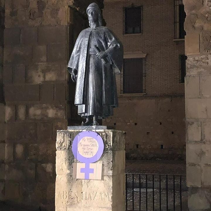 Este 8 de marzo de Huelga General y día internacional de la mujer multiplica su manera de expresar las reinvindicaciones feministas. Las cordobesas/es han contemplado en varias calles y plazas mensajes colocados en estatuas emblemáticas de la ciudad que, en la práctica, educan en feminismo. Mensajes tales como «no habrá cerrojo que puedas imponer a la libertad de mi mente» en la estatua de Cristobal de Santa Catalina; «Ni un paso atrás«, en la fuente junto a la Plaza Colón; «Hijo, el trabajo de la casa se comparte«, en la escultura denominada Vientos de cambio, «Fuera vuestros rosarios de nuestros ovarios», en la Plaza de las Capuchinas, presidida por el monumento al Obispo Osio, a quien se deben nada más y nada menos que la invención del catolicismo, mediante la fijación de su dogmática definitiva, y de instituciones de tan largo alcance en la historia europea y mundial como la persecución religiosa, la represión sexual universal y obligatoria, la judeofobia y la misoginia, preterición definitiva de la mujer de la vida pública, en palabras de nuestro colaborador Manuel Harazem; «¿Ande las lleva usted padre? Ahh, a enseñarles de igualdad«, en la estatua de Plaza de las Cañas; «Séneca y Nerón levantad los huevos del sillón«, en la estatua dedicada a estos dos insignes romanos, emperador y filósofo; A la estatua de Góngora que preside la plaza de la Trinidad se le dedicó el lema «Machote Gongoret, coge la escoba y barre, sipote«; o «suelta el capote y ponte a fregar sipote«, colgada de la estatua de Manolete en la Plaza de Santa Marina…