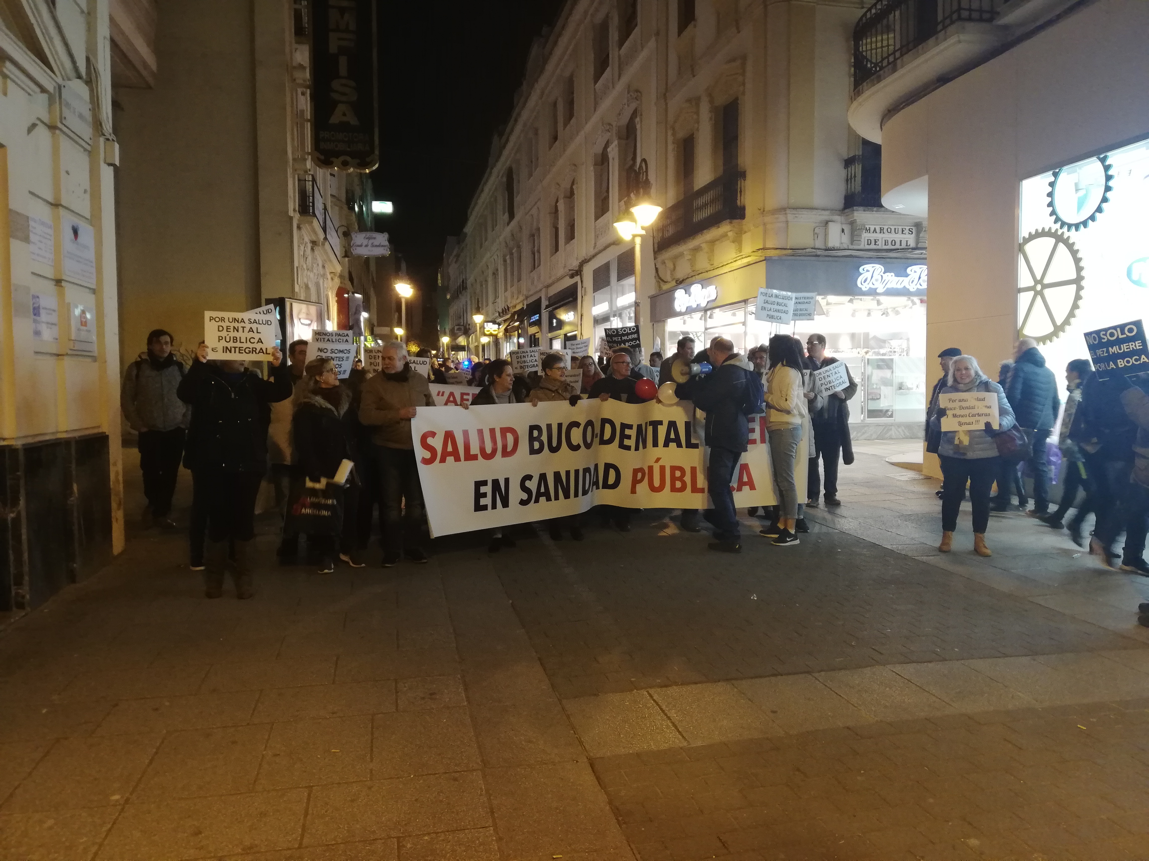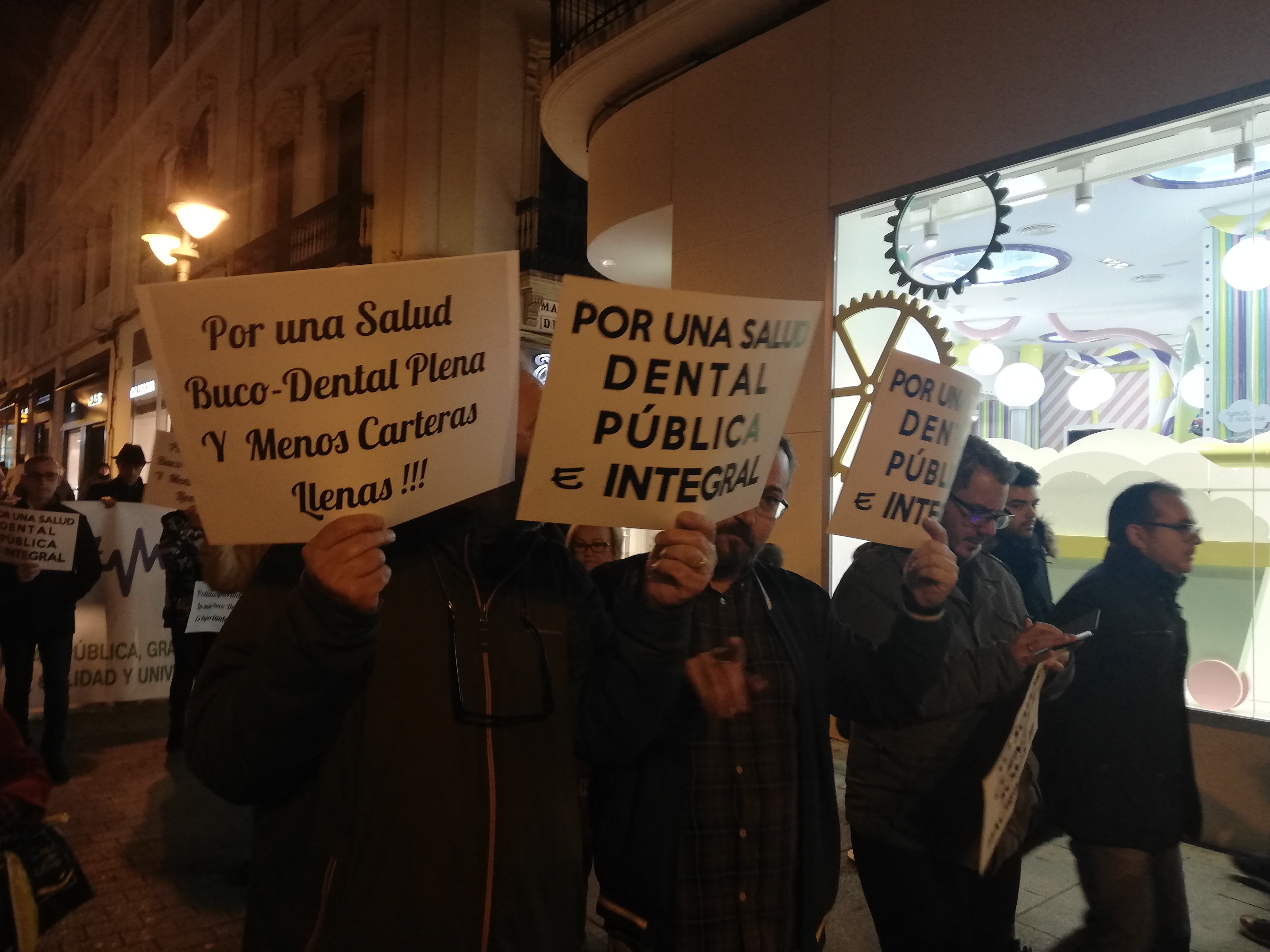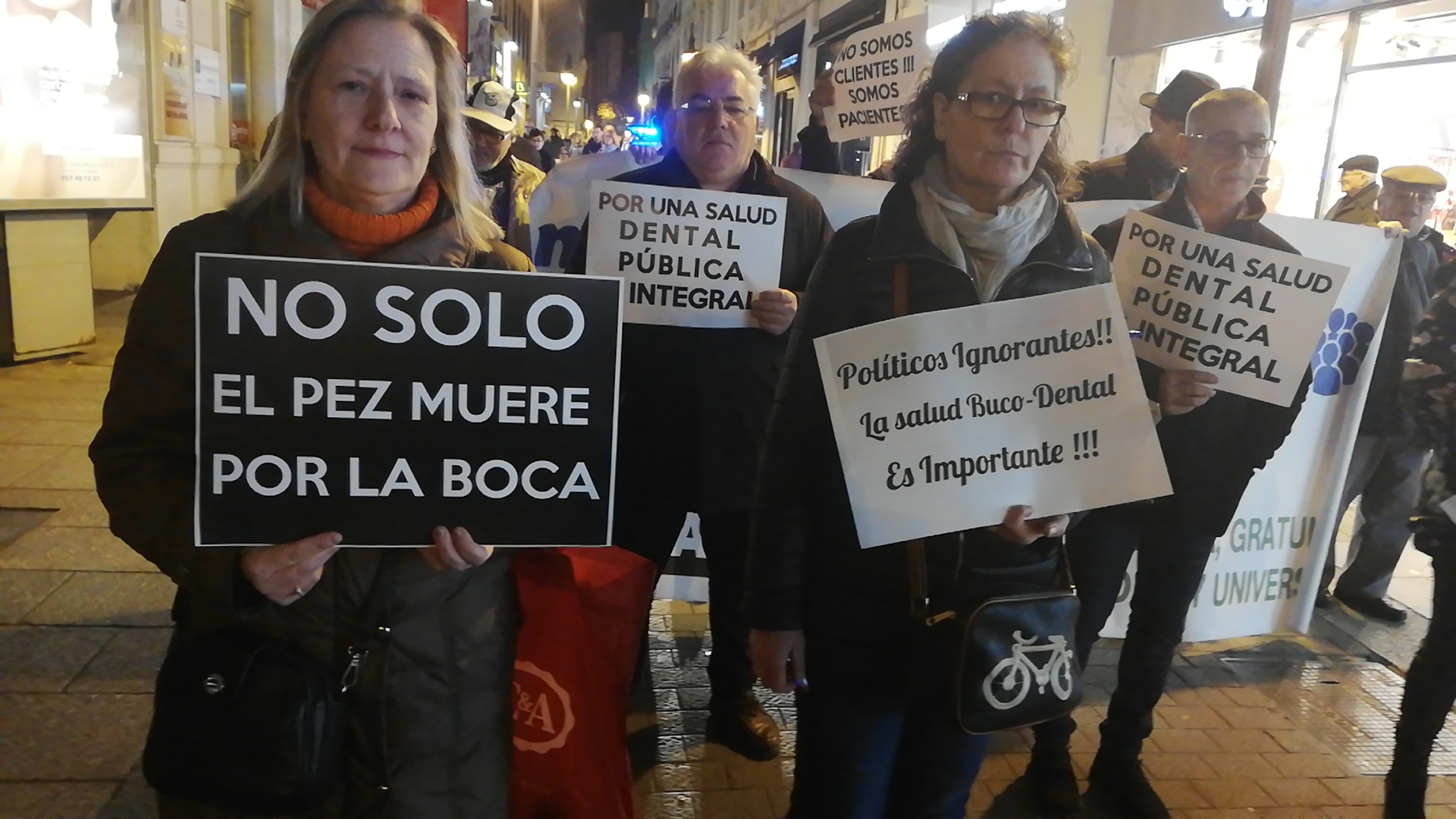 En el comunicado que se leyó al final de la marcha se reivindicó que «la salud bucodental debe ser un derecho de todas las personas y debería estar incluida en la ley general de Sanidad«, que «en los últimos años se ha establecido como norma una total privatización de la salud bucodental, que está exenta de pagar IVA», y que se está produciendo «un creciente aumento de precios al no existir una regulación legislativa, lo cual ha dejado a miles de personas desamparadas y sin posibilidad de poder acceder a tratamientos dignos». Una situación que se debe a que «por no estar incluida la salud bucodental en la sanidad pública, muchos profesionales han hecho un negocio muy rentable, sobre todo para las clínicas mercantiles, que nos ven como clientes, cuando en realidad somos pacientes».