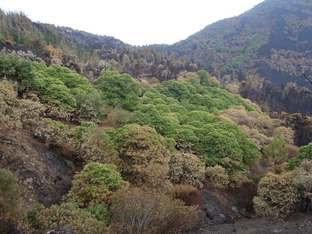 No obstante, es de destacar que han quedado numerosas islas sin quemar dentro del perímetro del incendio, que servirán de reservorio de biodiversidad y núcleos dispersores para la regeneración del bosque. También es importante la existencia de bosquetes de alcornoques, que han ralentizado el incendio, y que una vez más, las zonas adehesadas, los pastizales pastoreados, los enclaves cultivados y los bosquetes de castaños han funcionado como áreas cortafuegos.