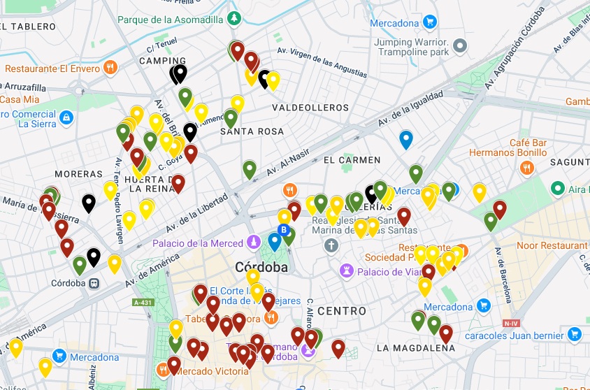 En primer lugar, el alumnado ha realizado una investigación sobre los diferentes tipos de barreras arquitectónicas que podemos encontrarnos, para posteriormente realizar un mapeo digital a través de la herramienta My Maps de Google. En este proceso, se han señalado y clasificado diferentes tipos de barreras en cuatro zonas concretas de la ciudad: Huerta de la Reina, Santa Rosa – Valdeolleros, Ollerías – San Agustín y el Centro de Córdoba hasta San Lorenzo.