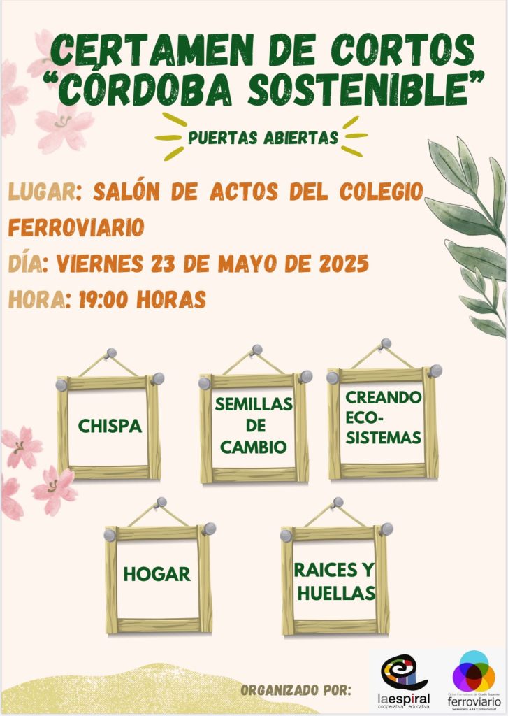 Este viernes 23 de mayo en el Salón de Actos del Colegio Ferroviario, tendrá lugar el Certamen de Cortos «Córdoba Sostenible» a las 19:00 horas. En este evento el alumnado del Ciclo de Grado Superior de Integración Social presentará 5 cortos que han realizado para visibilizar 5 alternativas sostenibles que se vienen desarrollando en nuestra ciudad.