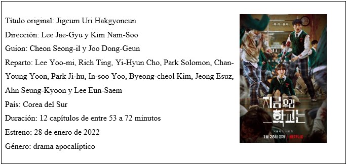 Otro de los fenómenos de Netflix que ha logrado posicionarse en apenas tres días entre las series más vistas, superando incluso a la ya afamada Squid Game (Hwang Dong-hyuk, 2021) o a la nueva temporada de Euphoria (Sam Levinson, 2019, HBO), se trata de Estamos muertos. En este nuevo audiovisual nos encontramos en Corea del Sur en la provincia ficticia de Hyosan, donde un extraño virus -sí, otro más- que convierte a los huéspedes en zombies se propaga entre los estudiantes de un instituto. Pero, aunque de primeras pensemos que se trata de otra repetitiva historia más del género zombie más como The Walking Dead (Robert Kirkman, 2010), los directores Lee Jae-Gyu (conocido por su trabajo en The King 2 Hearts, Yeok-rin o Wanbyeokhan tain: 2012, 2014 y 2018) y Kim Nam-Soo nos plantean algo distinto. Basándose en los 130 capítulos del webtoon de éxito Now at Our School (Joo Dong-geun, 2009-2011) y siguiendo la fórmula que ya encontrábamos en “k-dramas” de crítica social como El juego del calamar, Alice in Bonderland (Shinsuke Sato, 2020) o Rumbo al infierno (Yeon Sang-ho), esta serie nos habla de la presión que sienten los estudiantes coreanos, de la competitividad despiadada entre ellos, del bullying y del suicidio, siendo esta última la causa principal de muerte entre los adolescentes de Corea del Sur. Si bien solo hay que recordar el sistema educativo coreano donde los estudiantes se preparan durante doce años para el `suneung´, una prueba de acceso a la universidad que consiste en un examen de ocho horas que determina no solo dónde y qué podrán estudiar sino también a qué trabajos podrán aspirar los jóvenes surcoreanos.