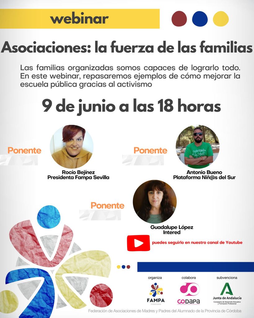 FAMPA Córdoba cierra el curso con la organización de una webinar con el título «Asociaciones, la fuerza de las familias«. Será el próximo lunes, 9 de junio, a las 18’00 horas a través de su canal de YouTube.
