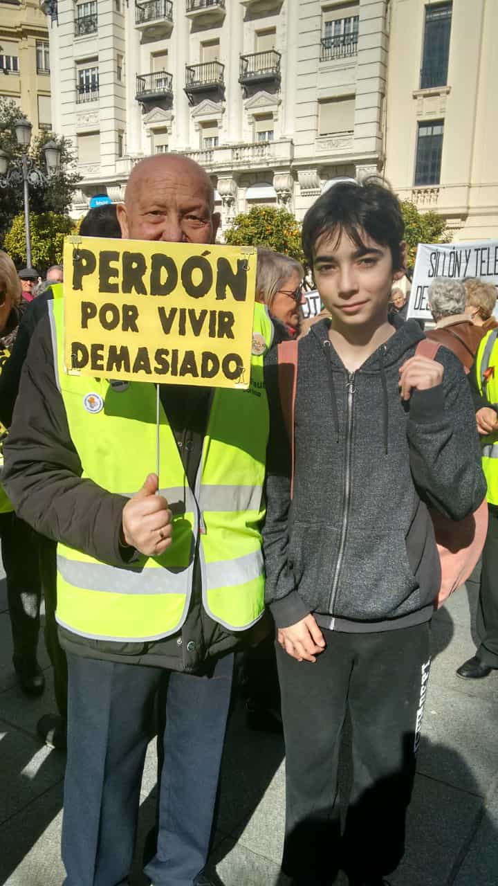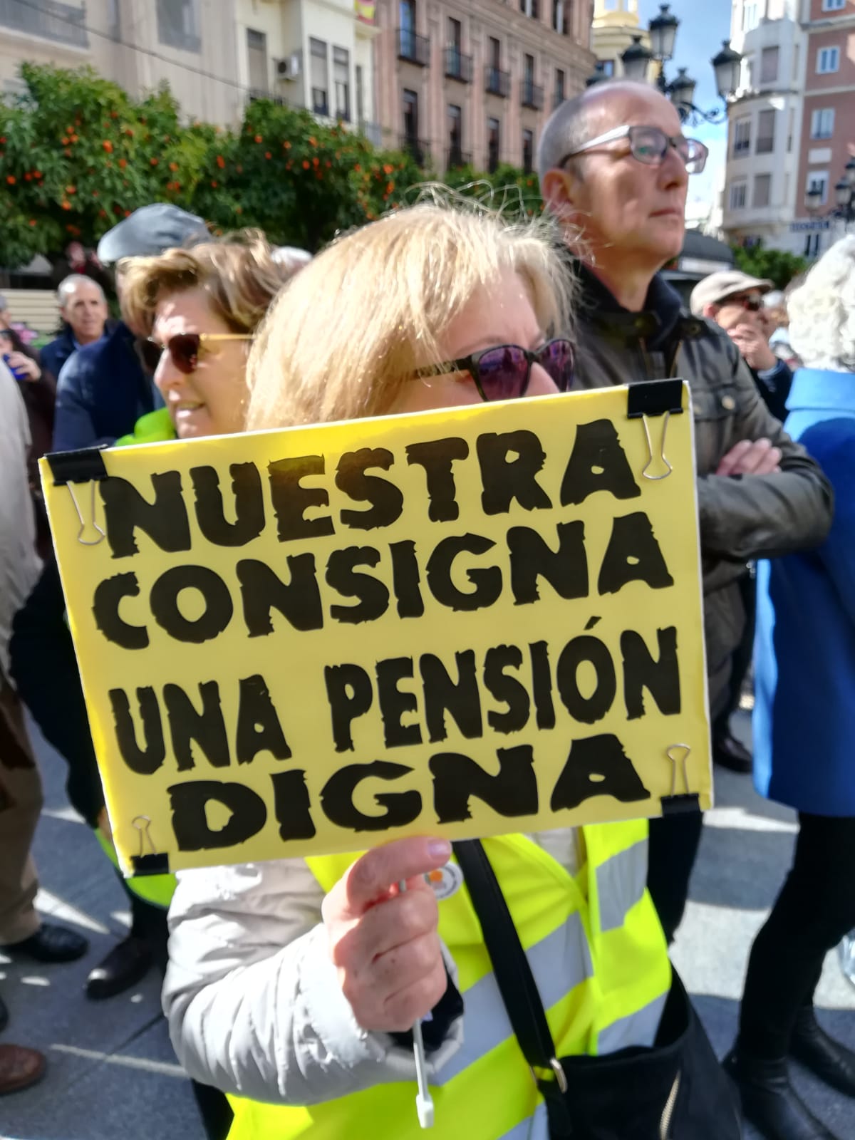 Multitud de pancartas llenaban la plaza, con lemas como «Pensiones = Dignidad» «NO a pensiones precarias» «Toda una vida trabajando, ¿para esto?» «Mi famila en paro, ¿cómo la mantengo?» o «Perdon por vivir demasiado».