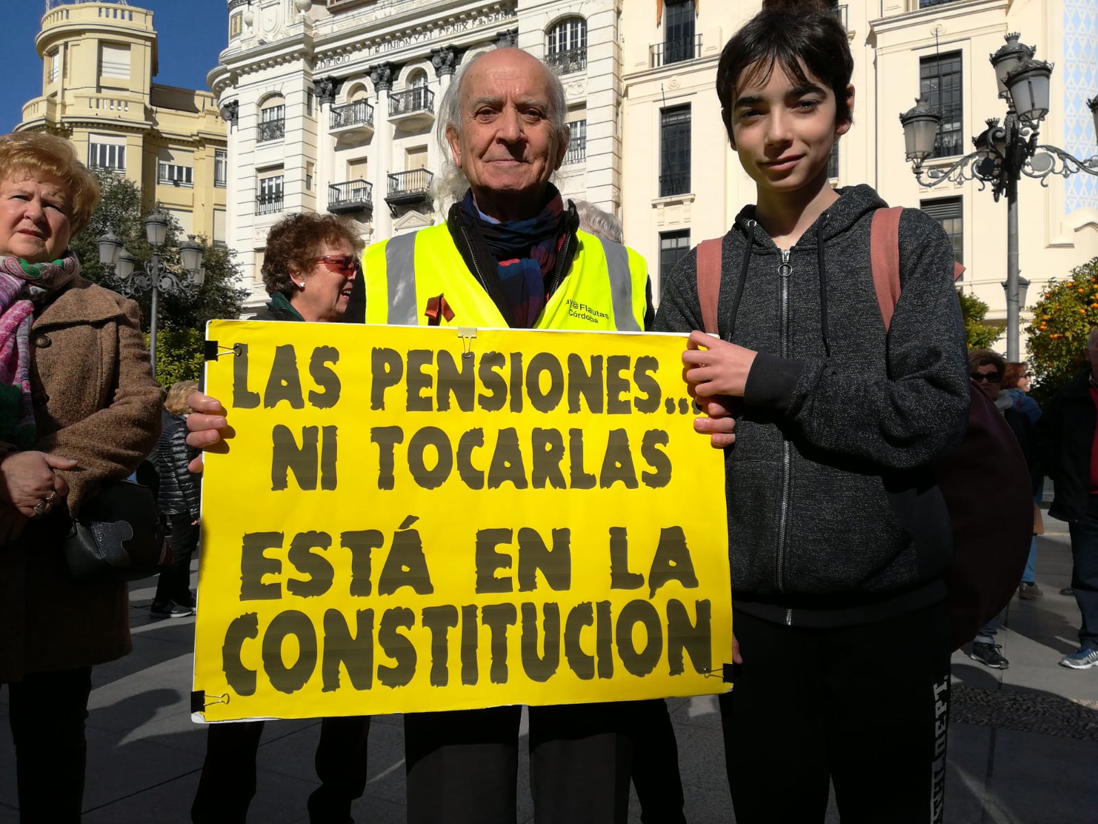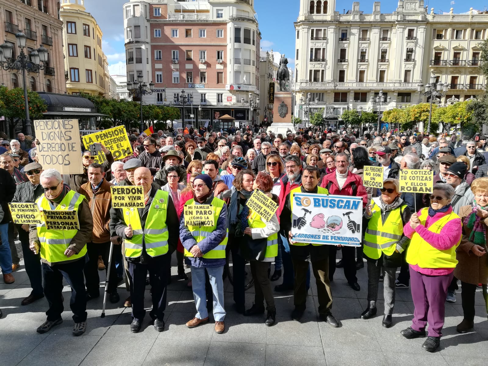La Plaza de las Tendillas volvió a reunir este sábado a varios centenares de jóvenes y mayores para defender las pensiones, en una concentración convocada por la Plataforma Ciudadana en Defensa del Sistema Público de Pensiones. En el acto de carácter reivindicativo las y los representantes de la plataforma alzaron su voz para dejar claro ante la ciudadanía y la representación política que no están dispuestos a renunciar a la jubilación ordinaria a los 65 años; a la jubilación sin penalizar con 40 o más años de cotización; a la pensión y un salario mínimo de 1084 euros mensuales; a la revalorización anual de las pensiones según el IPC real; a la derogación del factor sostenibilidad; a la reducción hasta la desaparición de la brecha de género; a la eliminación de copago farmacéutico; y, de forma general, a las pensiones garantizadas en la Constitución y los Presupuestos.