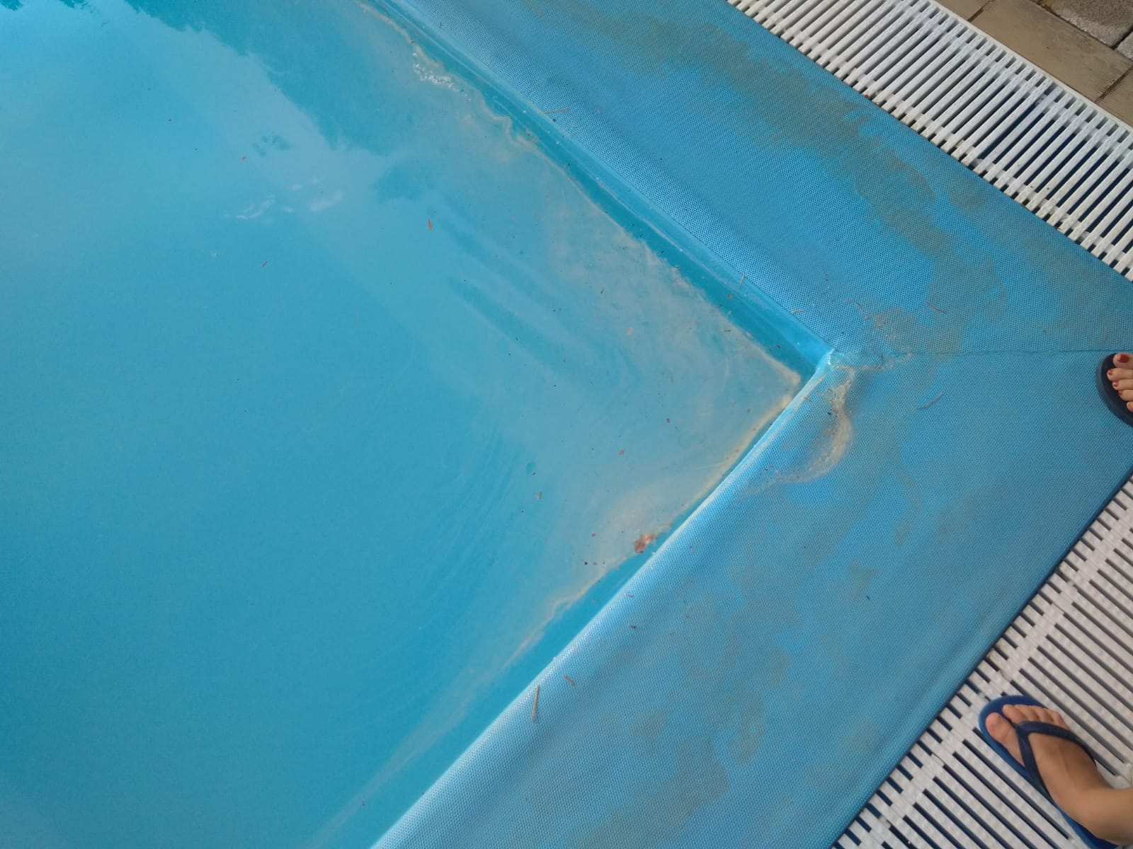 Pero la emoción ha durado bien poquito. Pronto me ha vuelto la desazón al comprobar que el césped está embarrado y calvo por varias zonas, como si hubiera soportado meses de entrenamiento de cientos de chiquillos y chiquillas jugando al fútbol. Sorpresa al ver las persianas de un bar cerrado, por lo que no se puede comprar ni una botella de agua fría en días como el de hoy con más de 40 grados. Y, de nuevo, indignación al comprobar unos servicios tan viejos como ajados y un agua para bañarse, que tras 24 horas de uso (8 horas por 3 días) acumula una cantidad de suciedad y baba más típica de final de verano, que de principios de temporada, como desgraciadamente estamos. Aunque, dicho sea de paso, ni a final de verano hemos visto así nuestra piscina.