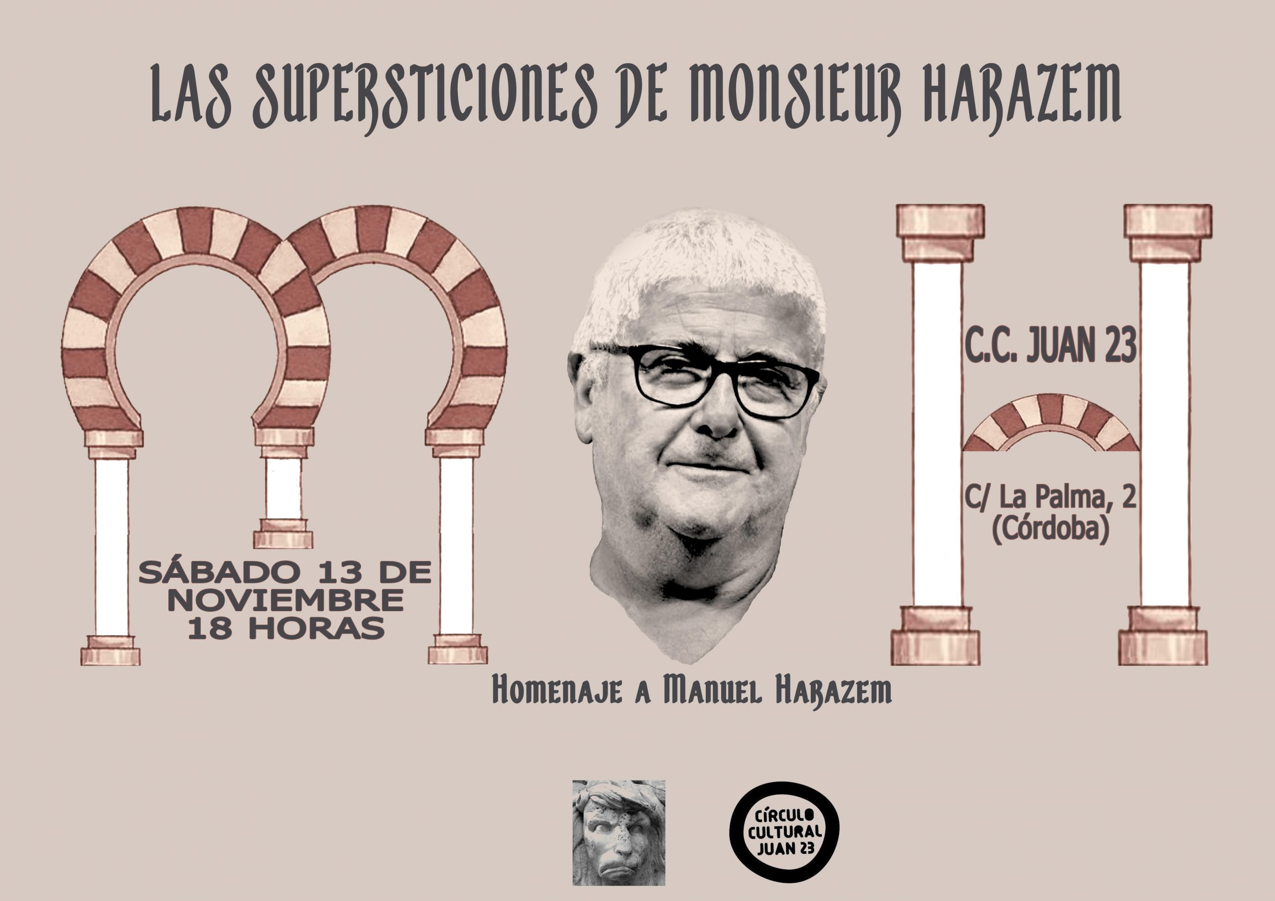 El Círculo Cultural Juan 23 tributará el próximo sábado 13 de noviembre un homenaje al escritor e investigador cordobés Manuel Harazem (1956-2020). Este acto lleva el título de «Las supersticiones de Monsieur Harazem» y comenzará a las 6 de la tarde. Al mismo han confirmado su presencia como ponentes: Rafael Martínez, Juan Zapater, Carmen Panadero y Victoria Falcón.