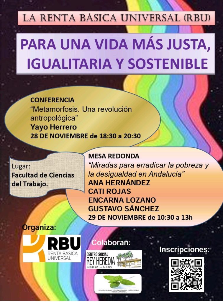 La Plataforma Renta Básica Universal de Córdoba comunica que los días 28 y 29 de noviembre se llevarán a cabo las jornadas tituladas: “Renta Básica Universal para una vida más justa, igualitaria y sostenible”, en la Facultad de Ciencias del Trabajo.
