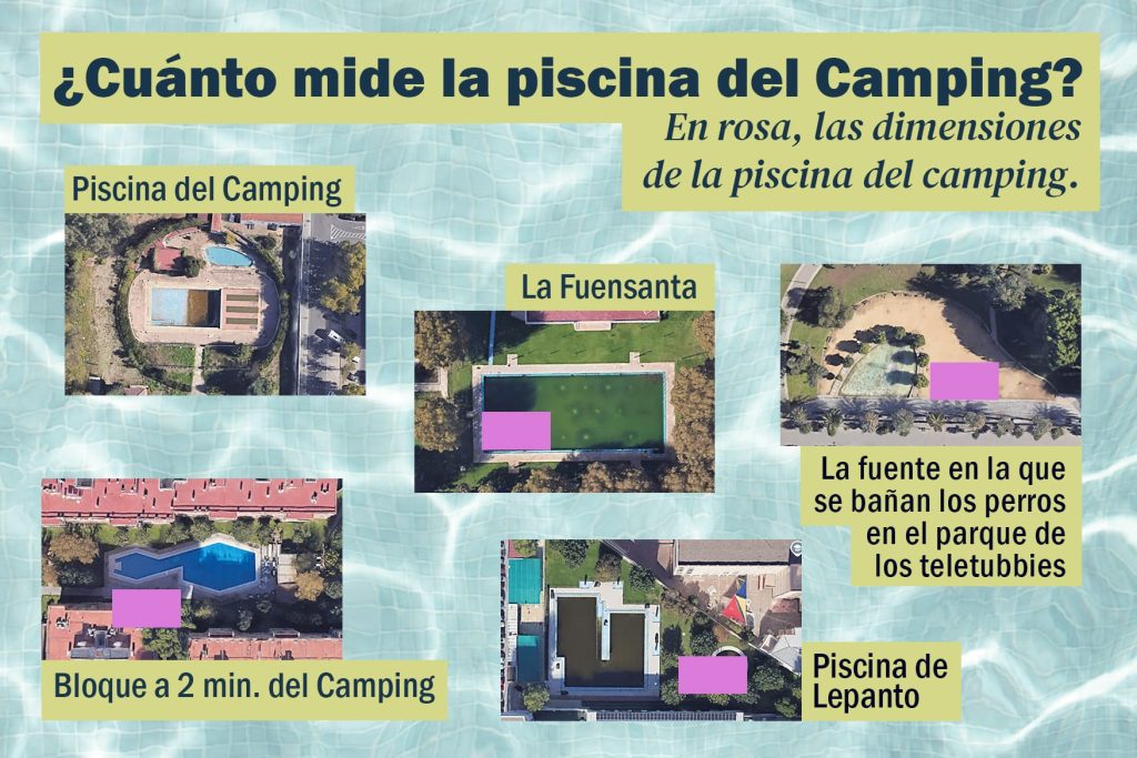 Por último, la asociación explica que la piscina del camping es demasiado pequeña para responder a las necesidades de todo el barrio. En tamaño, es la mitad en tamaño que la de uno de los bloques cercanos, es tres veces más pequeña que la piscina de Lepanto y cuatro veces más que la de la Fuensanta, siendo incluso más pequeña que la fuente del parque de los teletubbies, por lo que sería más grande el espacio para el baño para los perros que para ellos, denuncian.