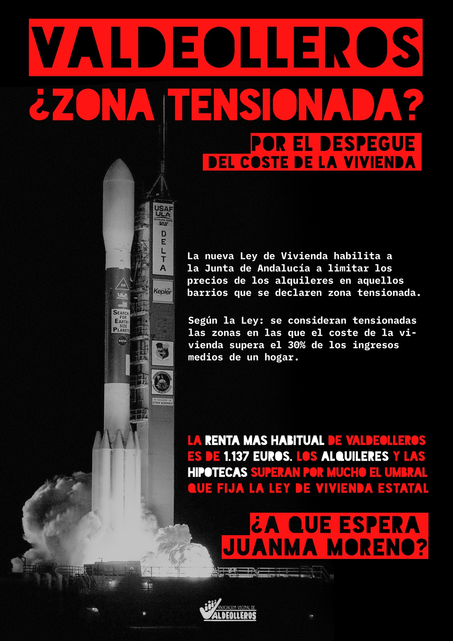 Por todo ello, la Asociación Vecinal de Valdolleros reclama que la vivienda deje de ser una forma de enriquecimiento y un privilegio y se convierta en un derecho constitucional, un bien esencial y de primera necesidad impidiendo su acaparamiento, para que con un trabajo y un sueldo digno se pueda acceder a su disfrute y por lo tanto: «urge a la Junta de Andalucía y el Ayuntamiento que aplique la ley, para a corto plazo limitar los precios de alquileres y a largo plazo promover la construcción de viviendas sociales.