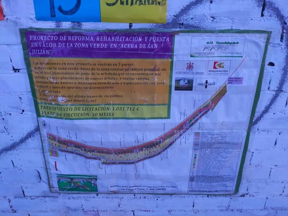 También le recuerdan al actual cogobierno municipal de PP y Cs que las obras de rehabilitación del Paseo de San Julián estaban anunciadas para comenzar en agosto. Esta actuación se acordó con la propia Asociación Vecinal Guadalquivir del Campo de la Verdad y con la vecindad. La obra asciende a un total de 1.031.712€ y están adjudicadas a la empresa VIGUECONS ESTÉVEZ, S.L. por un valor de 651.573,12€, recorte que, según la Asociación, «evidencia claramente que lo acordado con la vecindad no se va a realizar, como la prolongación de la obra a la calle Doctor Rafael Blanco León tampoco«. Hay que recordar que la Diputación provincial aporta al proyecto 500.000€, mientras la aportación del Ayuntamiento es una mínima cantidad de 151.573,12€.