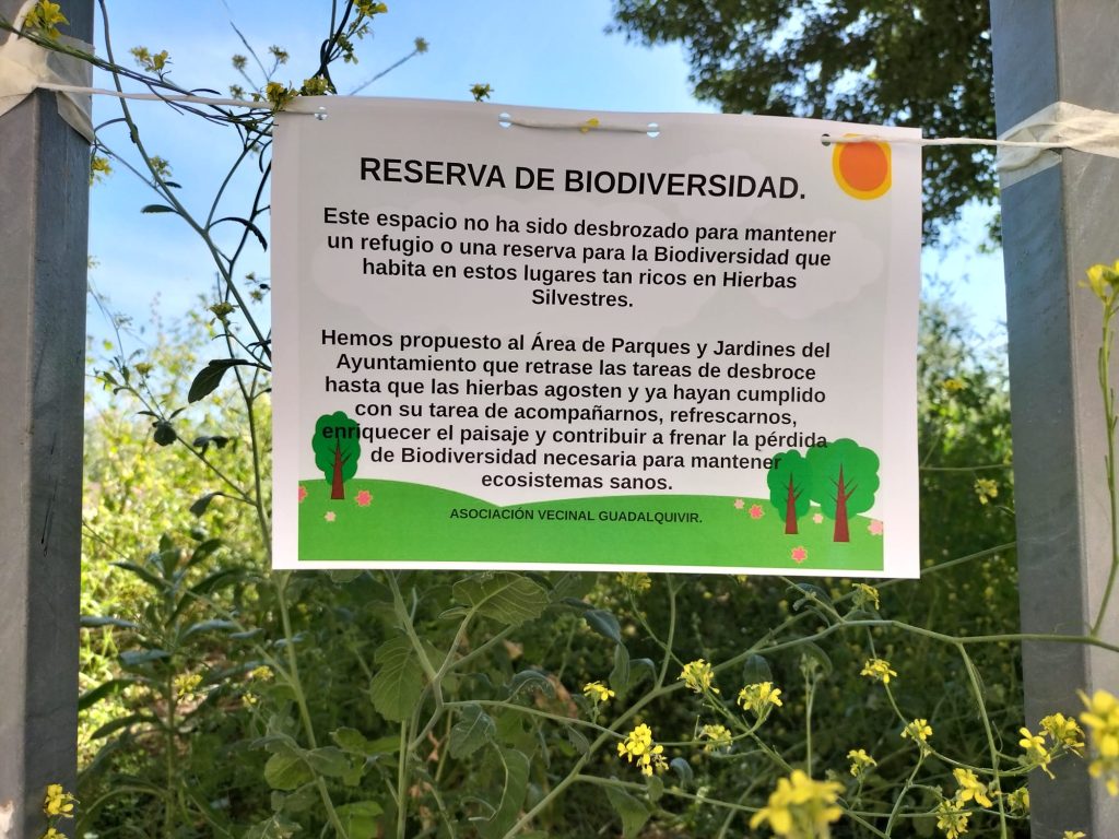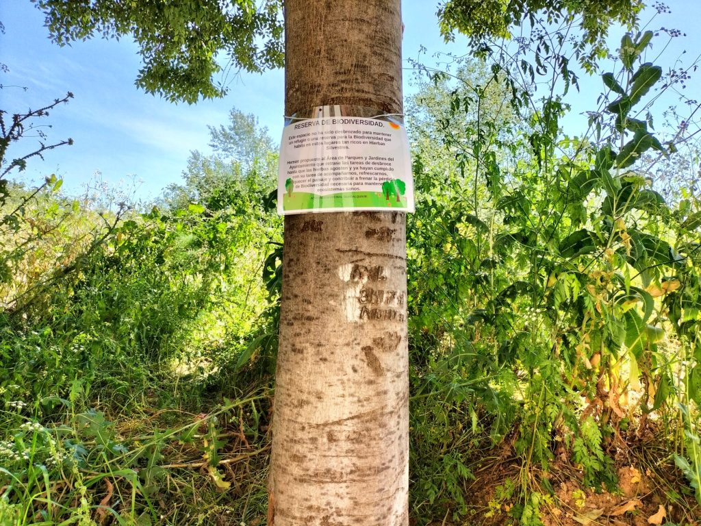 La señalización instalada por la Asociación indica textualmente: “Este espacio no ha sido desbrozado para mantener un refugio o una reserva para la Biodiversidad que habita en estos lugares tan ricos en Hierbas Silvestres«. «Hemos propuesto al Área de Parques y Jardines del Ayuntamiento que retrase las tareas de desbroce hasta que las hierbas agosten y ya hayan cumplido con su tarea de acompañarnos, refrescarnos, enriquecer el paisaje y contribuir a frenar la pérdida de Biodiversidad necesaria para mantener ecosistemas sanos», manifiestan.