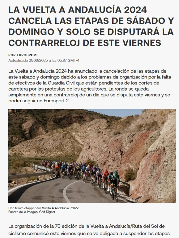 Resulta revelador contrastar la indignación actual con la silenciosa aceptación que acompañó la suspensión de la Vuelta a Andalucía 2024, interrumpida por protestas de agricultores aleccionados. Episodio inadvertido donde nadie exigió medidas punitivas. Los “amantes” del ciclismo tampoco recordarán 1978 donde se suspendió la última etapa, solo con troncos. La discrepancia en las respuestas plantea preguntas incómodas: ¿por qué unas protestas merecen mayor repudio que otras? ¿Acaso 50.000 vidas perdidas en Gaza valen menos que 50.000 tomates?