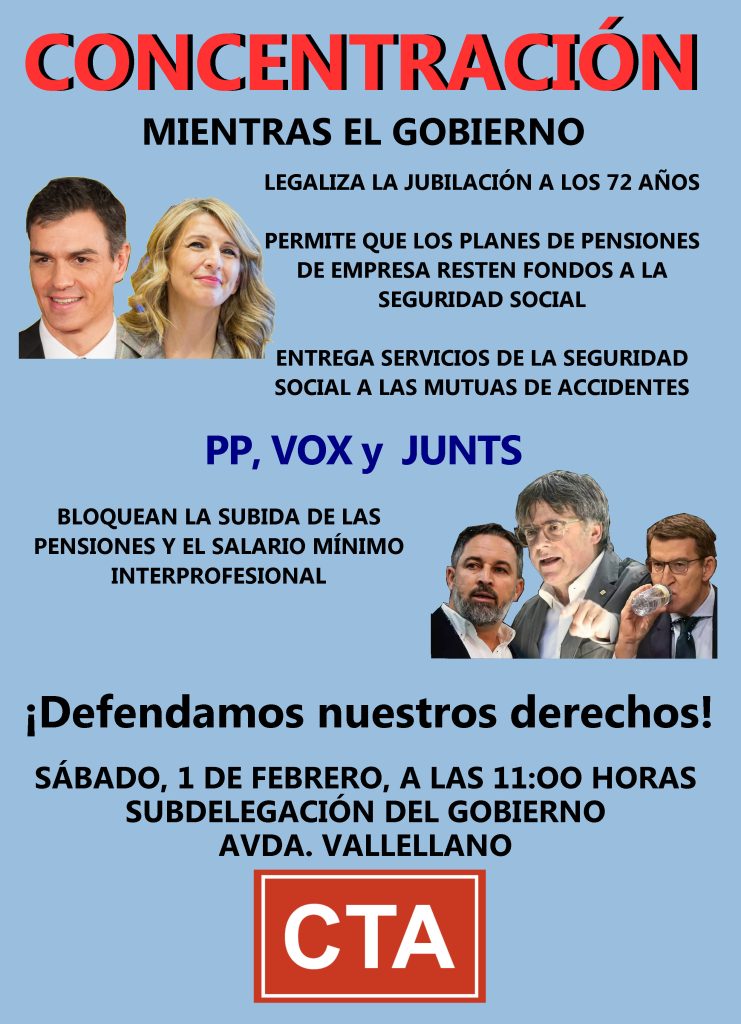 Por todo lo anterior, CTA invita a participar en la concentración que se realizará el próximo día 1 de febrero, sábado, a las 11 horas, en la avenida Vallellano, en la puerta de la Subdelegación del Gobierno. Para rechazar estas nuevas medidas en torno a la edad de jubilación.