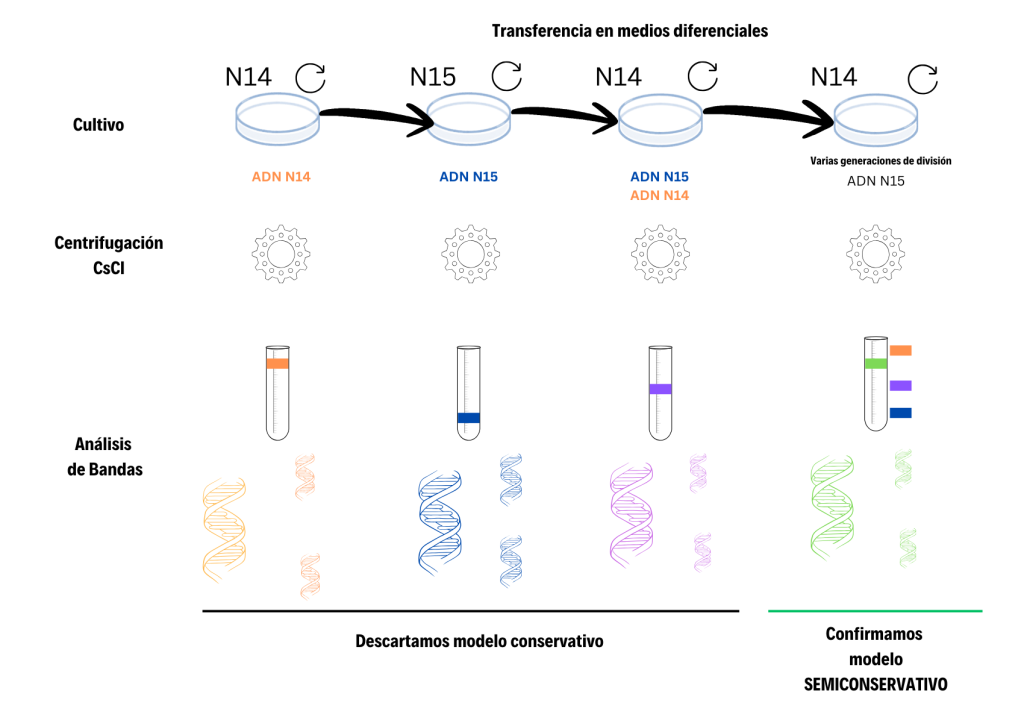 Después de una sola ronda de replicación en N14, Meselson y Stahl observaron una sola banda de densidad intermedia (entre “pesada” y “ligera”), lo cual descartaba el modelo conservativo (que hubiera mostrado dos bandas: una pesada y una ligera). En lugar de eso, cada ADN tenía una hebra vieja (N15) y una nueva (N14), consistente con el modelo semiconservativo.
