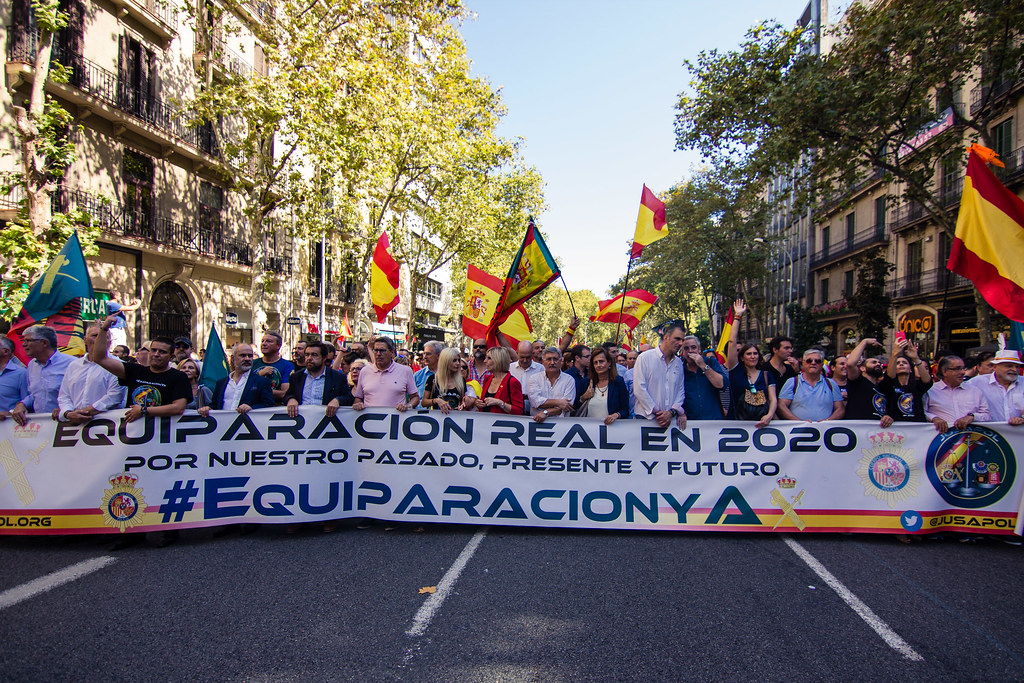 El martes 3 de marzo de 2020, centenares de policías y guardia civiles convocados por el ¿sindicato? JUSAPOL, llegaron hasta el Congreso de los Diputados. Entre los manifestantes destacaban los disfrazados con máscaras y los que tiraban petardos. Rompieron el cordón policial, se plantaron en las escaleras del Parlamento, insultaron a diputados, fueron arengados por sus representantes políticos (Vox), camparon a sus anchas… y en ningún momento sufrieron la mínima presión o represión por parte de las UIP, las omnipresentes unidades de antidisturbios de tantas manifestaciones. No había ninguna.