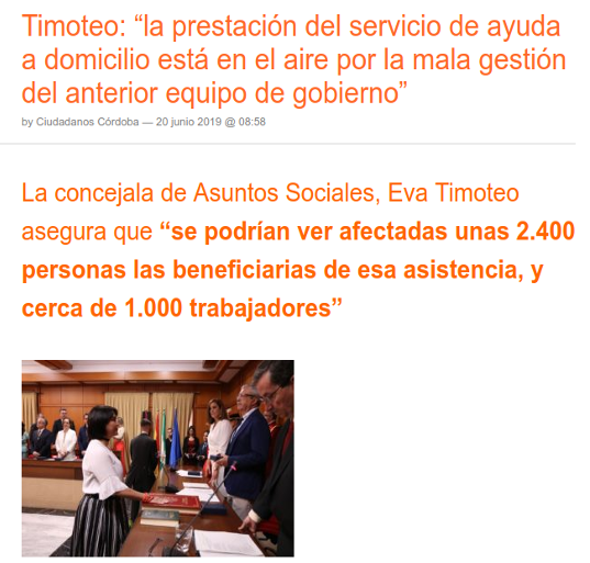 Lo que a mí me resultó muy significativo se me ha confirmado en tan sólo unas horas con una responsabilidad pública de esta persona: Llega como elefante a una cacharrería, sin haberse leído la ley ni haberse dejado asesorar por ningún funcionario (la número tres es ella, claro) y ya ha montado el primer pollo que, si no fuera por la gravedad de lo que ha aseverado, quedaría por algo grotesco propio de los currículum de los y las candidatas de la derecha: community manager de alguna mascota de algún jefe suyo. Lo primero que ha hecho es mentir sobre algo que no sé si es más grave desconocer o engañar. Lo segundo, asustar a 1000 personas que trabajan en el sector y a casi 2500 usuarias. Lo tercero, pasadas un par de horas, firmar lo que veía imposible firmar: la prórroga del convenio. Y, lo cuarto, ¡ay lo cuarto! Destaparse por completo: la gente a la que ha venido a servir ya puede estar tranquila porque lo que la Sra. Timoteo tiene claro es que un servicio esencial para la vida de personas que lo pasan mal tiene que estar en manos privadas para que esos a los que han venido a servir puedan seguir haciéndose ricos, muy ricos, obscenamente ricos a costa del dolor y el sufrimiento de las personas.
