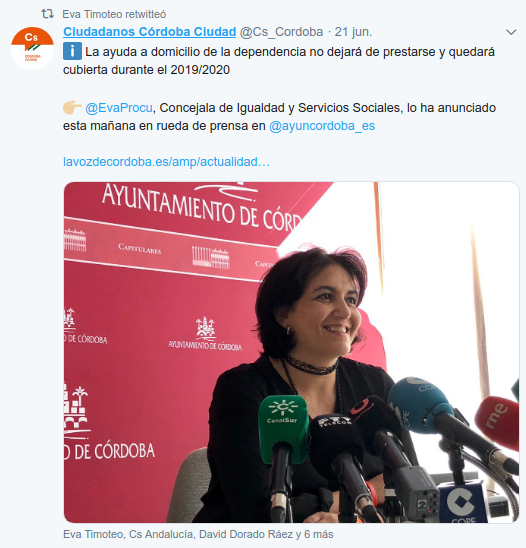 A la flamante Delegada de Asuntos Sociales del Ayuntamiento de Córdoba, la naranja Eva Timoteo, la he conocido en dos ocasiones durante la campaña. Una en la calle. La presentación: Hola, Rafael Juan, encantado. Ella: Eva Timoteo, número tres en la lista de Ciudadanos al Ayuntamiento de Córdoba. Me llamó la atención. Unos días después vino a Paradigma Radio, como acompañante de su correligionario, Antonio Barrionuevo, a un debate organizado por Córdoba Laica sobre el laicismo en los Ayuntamientos. Sobre el contenido, nada nuevo: somos laicos, pero apoyamos los actos religiosos, pero si hace falta, buscamos otra fórmula. Pero Eva, conforme llegó, volvió a emplear la misma fórmula: Hola, Eva Timoteo, número tres en la lista de Ciudadanos al Ayuntamiento de Córdoba. Así hasta ocho veces porque se presentó al resto de tertulianas y tertulianos, al técnico, y a compañeros y compañeras de Paradigma Radio que iban llegando por el estudio.