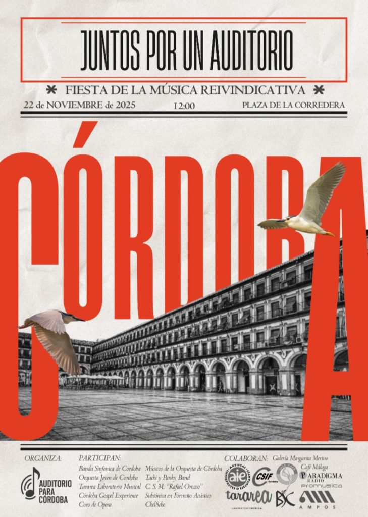 La Plataforma “Auditorio para Córdoba” organiza una “Fiesta Reivindicativa del Mundo de la Música en Córdoba”, para el próximo sábado día 22 de noviembre, a las 12:00 horas, en la Plaza de la Corredera.