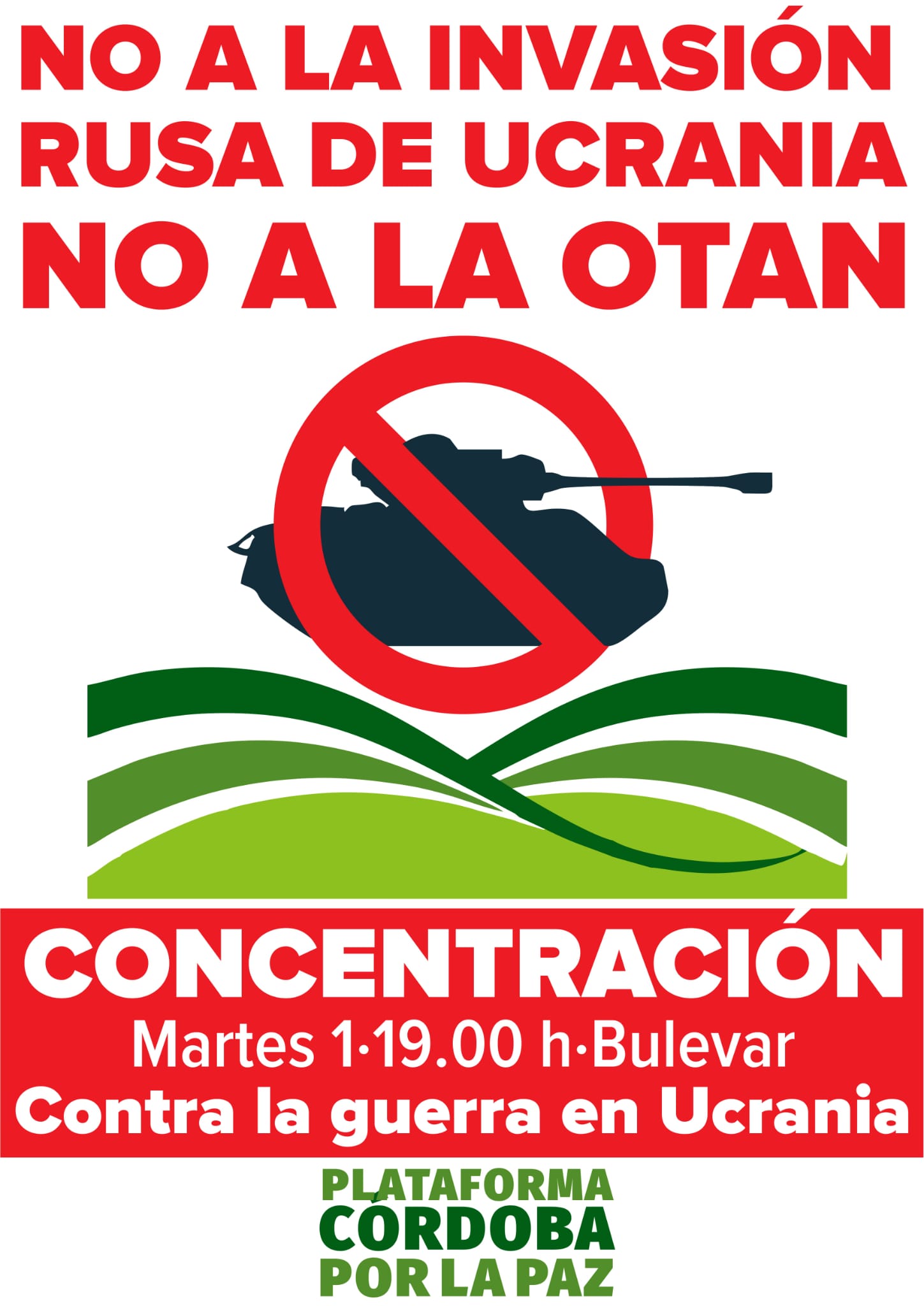 Convocamos a las cordobesas y cordobeses a la concentración que tendrá lugar el próximo martes 1 de marzo a las 19 horas junto al templete del Bulevar Gran Capitán de Córdoba para alzar nuestra voz proclamando que la guerra no es una exigencia ineludible.