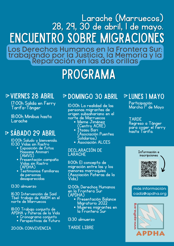 La Asociación Pro Derechos Humanos de Andalucía denuncia que el gobierno marroquí ha prohibido la realización del encuentro «Los Derechos Humanos en la Frontera Sur: trabajando por la Justicia, la Reparación y la Memoria en las dos orillas«, programado para los días 28, 29, 30 de abril y 1 de mayo en Larache (Marruecos). El encuentro estaba organizado por la APDHA, por la Asociación marroquí Pateras de la Vida y por la asociación AMVS (Asociación de ayuda a las personas Migrantes en Situación de Vulnerabilidad).