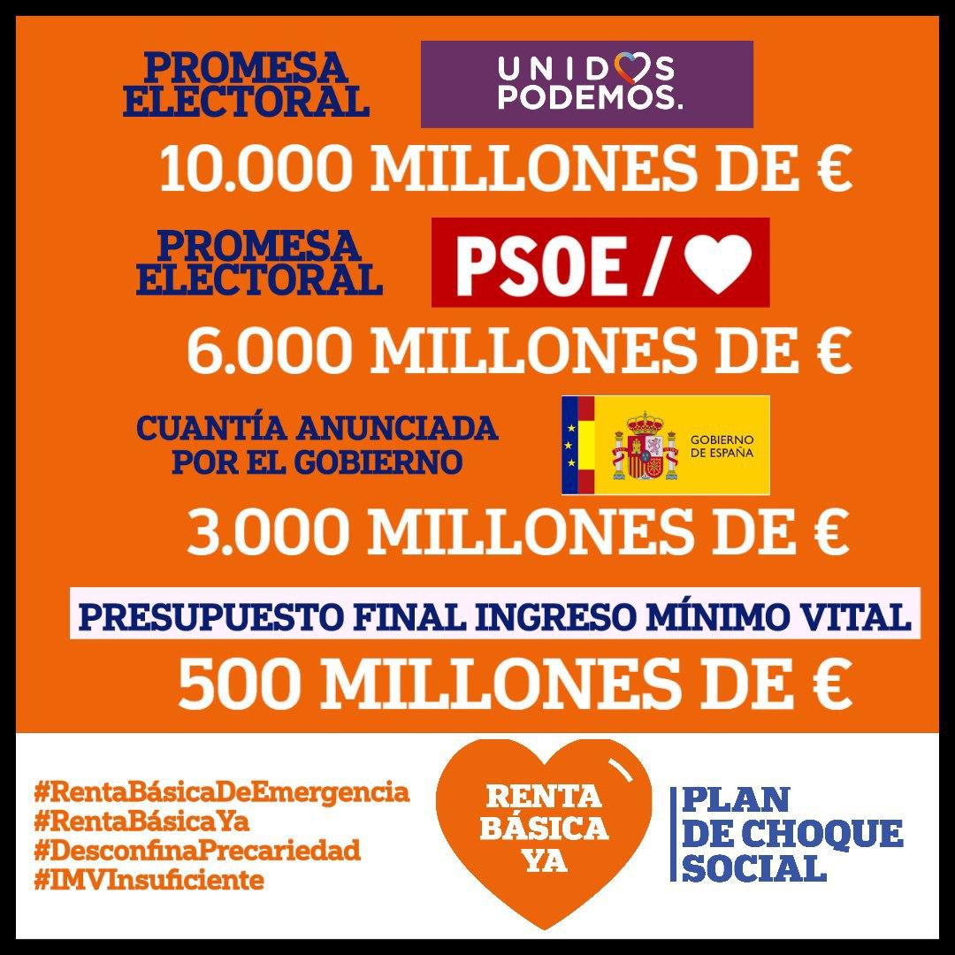 Afirman que el Ingreso Mínimo Vital no va a llegar a gran parte de personas que lo necesitan y que la cantidad presupuestada queda lejos de lo prometido en campaña electoral.