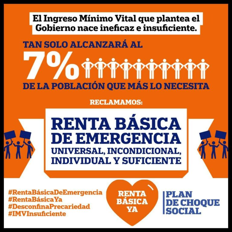 Consideran que no dará cobertura ni a una cuarta parte de las familias en pobreza severa de este país, ni mucho menos a los doce millones de personas que viven por debajo del umbral de pobreza en España (cifrado en 739 euros mes/persona por EUROSTAT) según la AROPE en 2019, población en grave riesgo de exclusión, que va en aumento tras la crisis sociosanitaria sin precedentes que estamos viviendo. Aún así piden que lo solicite todo el mundo que lo necesita y posteriormente organizar la lucha para exigir que se amplíen los presupuestos acordados.