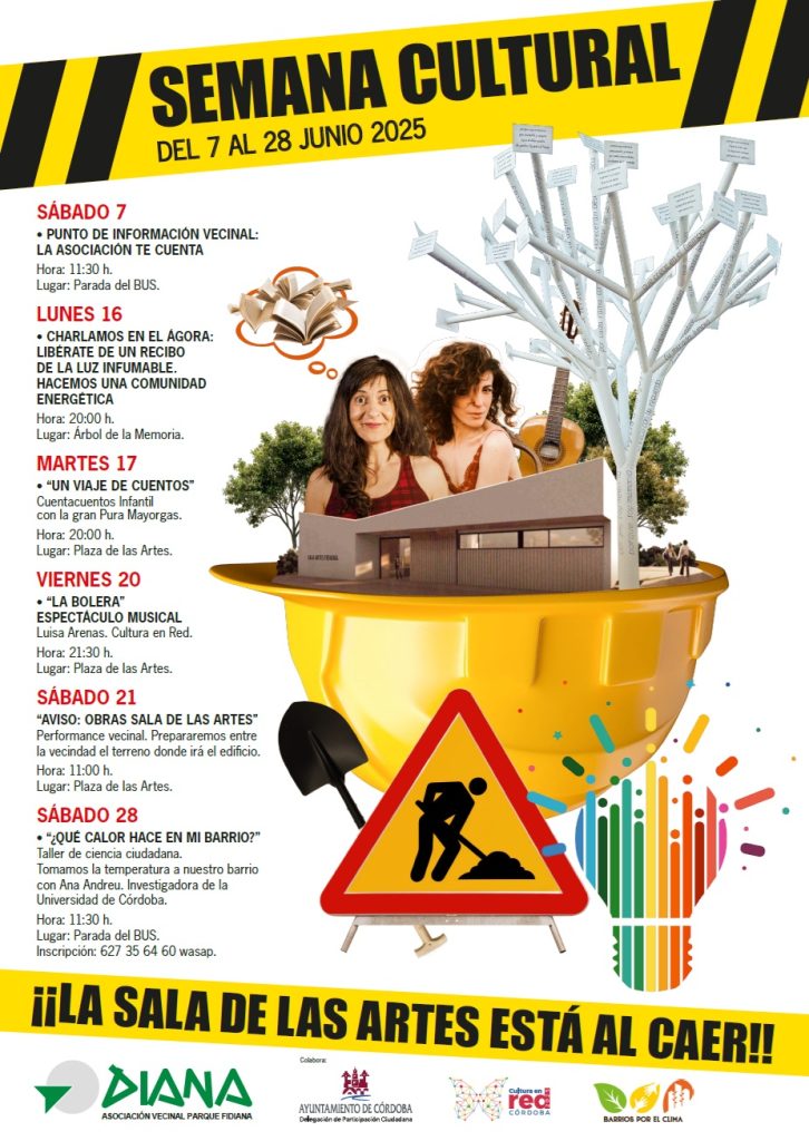 El próximo sábado, 21 de junio de 2025, en el marco de la Semana Cultural del Parque Fidiana que se desarrolla entre el 07 y el 28 de junio y que tiene como lema “LA SALA DE LAS ARTES ESTÁ AL CAER”, la asociación vecinal Diana, que lleva 26 años demandando un equipamiento municipal para su desarrollo social y cultural, desarrollará un performance vecinal con el título de “AVISO POR OBRAS: CONSTRUCCIÓN DE LA SALA DE LAS ARTES”.