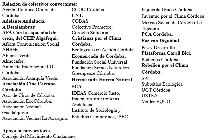 Finalizada la representación y como cierre de la Concentración se leerán los manifiestos elaborados por las organizaciones convocantes y por Juventud por el Clima-Fridays for Future Córdoba.