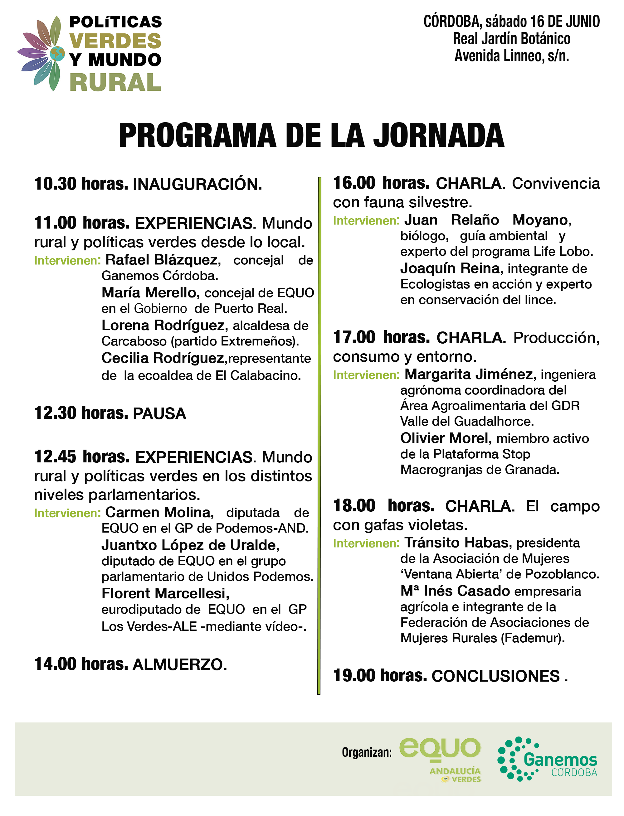 Andalucía, 11 de junio de 2018. Más de medio centenar de personas se han inscrito ya, en menos de una semana, para participar en la jornada que EQUO Andalucía Verdes y Ganemos Córdoba organizan este próximo sábado 16 de junio en Córdoba sobre políticas verdes y mundo rural.