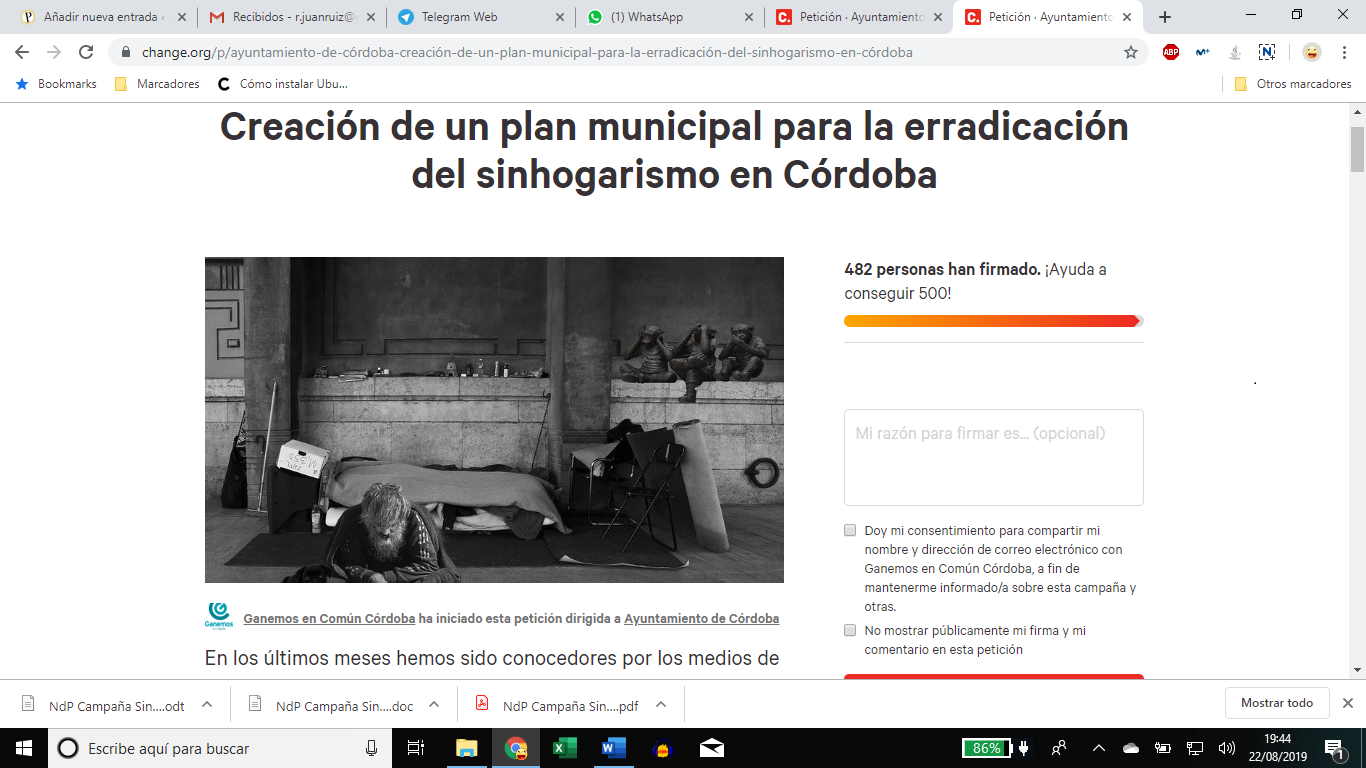 Hace poco menos de un mes Ganemos en Común presentaba una campaña de firmas al Ayuntamiento de Córdoba, y, en concreto, a la Delegada de Asuntos Sociales, de Ciudadanos, Eva Timoteo, para que desarrollara y pusiera en práctica un Plan Estratégico para la erradicación del sinhogarismo, de forma participada con varios colectivos, en nuestra ciudad.