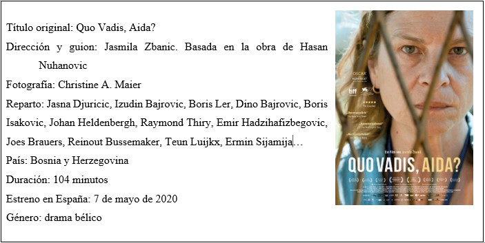 Quo Vadis, Aida?, por tanto, se trata de una obra que pertenece al cine de denuncia que, en este caso en concreto, va a tratar la eterna herida abierta del conflicto de los Balcanes, siendo este tipo de audiovisuales obras necesarias para no olvidar nunca el pasado y conseguir reconstruir los recuerdos, esa memoria colectiva tan necesaria, sobre todo para que no se vuelvan a repetir los mismos deleznables hechos. Es así como el filme de Jasmila Zbanic, al igual que sus otras obras, nos va a dejar reflexionando sobre cómo podemos llegar a este tipo de situaciones tan cuestionables, las cuales podemos comprobar a día de hoy, que incluso se siguen repitiendo.