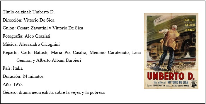 Por otro lado, como hemos señalado al inicio del artículo, el cine realista no solía considerarse como arte en sus inicios, pero en este espacio tratamos de mostrar, a través de la obra Umberto D., cómo sí lo es, encontrando una forma fílmica que va a revelar las formas de realidad social. El protagonista de este filme es Umberto Domenico Ferrari (Carlo Battisti), un funcionario jubilado con una pensión tan miserable que se ve sumido en un tránsito paulatino hacia la pobreza, teniendo que verse forzado a abandonar su vivienda junto a su único compañero fiel, su perro Flike. Este tema clásico sobre la precariedad, tan característico del neorrealismo, no solo muestra un cine desesperanzador y humanista, sino costumbrista, donde el conflicto va a crear una batalla interna entre la dignidad que le impide mendigar, y su necesidad de dinero.