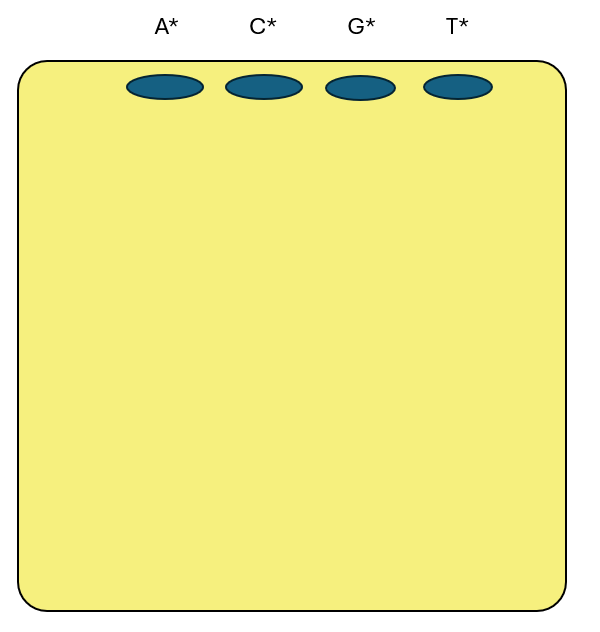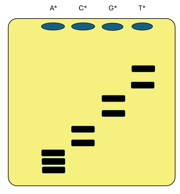 El protocolo ahora cambia un poco, y en lugar de sólo replicar la secuencia en una única solución, necesitamos pasar a 4 soluciones, en cada una de las cuales se dispone un nucleótido bloqueante correspondiente. Al aplicar un campo eléctrico durante tiempo se obtiene este patrón de bandas: