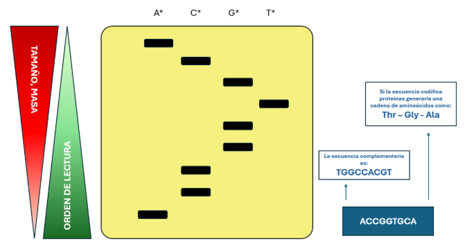La replicación del ADN se puede hacer de forma truncada sobre la cadena que se quiere “leer”, si se tienen varias réplicas del experimento de reproducción, cada una de ellas con un nucleótido (A, C, T, G) que bloquea el proceso y cada mezcla de replicación se separa en un gel de acrilamida, se puede leer la secuencia mirando el gel de abajo a arriba:
